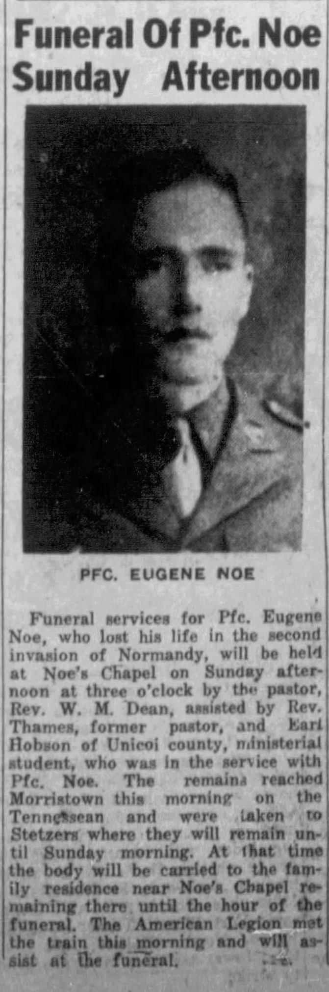 “PFC. Eugene H. Noe died in France from wounds received, according to information received from the War Department. He entered service on June 3, 1942, and was trained at Camp Pickett, Va., and Camp Blanding, Fla. He participated in maneuvers in Middle Tennessee and desert training in Arizona. He was sent to England early in April 1944 from Camp Phillips, Kansas, where he had spent several months. He was member of Company C, 313th Infantry, 79th Division.”