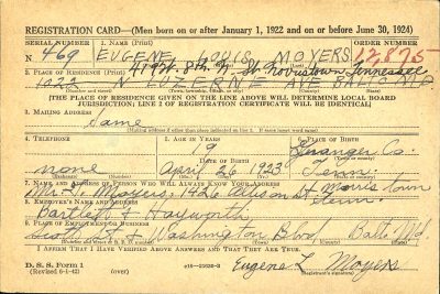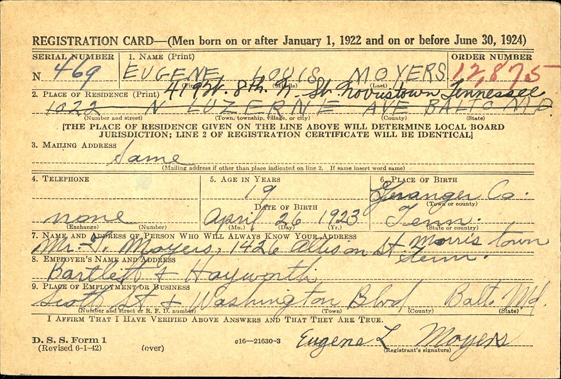 Eugene Louis Moyers was born in Granger County, Tennessee, the son of Eugene Leonard Moyers and Lula Jane Roberts.