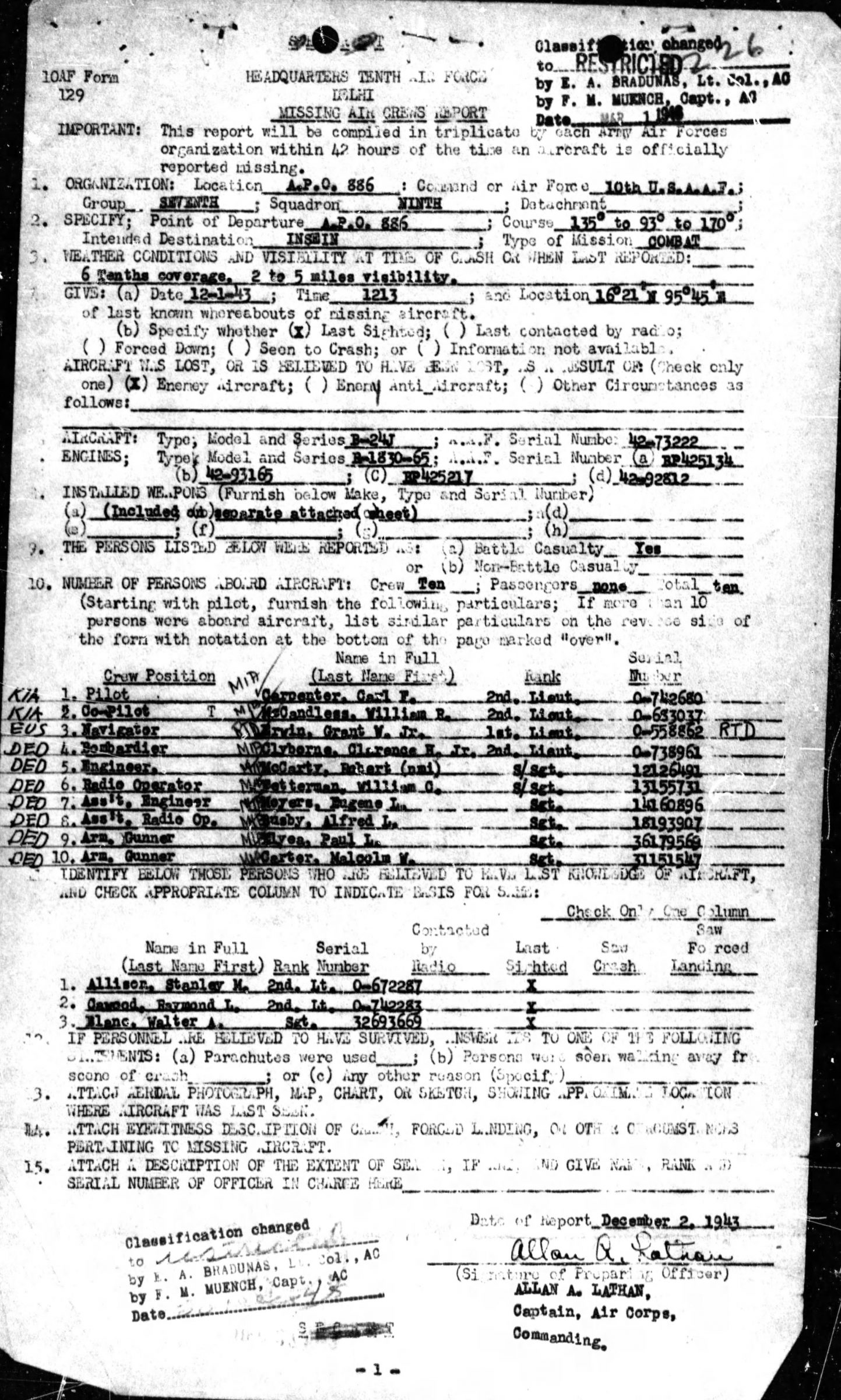 Aircraft B-24J with serial number 42-73222 was on a bombing mission to Rangoon, Burma. After about ten minutes after leaving the target area the ship was seen to explode in midair. The aircraft crashed 3 to 5 miles south of Chaungpyaw, which is a small village in the Bassein district of southern Burma.