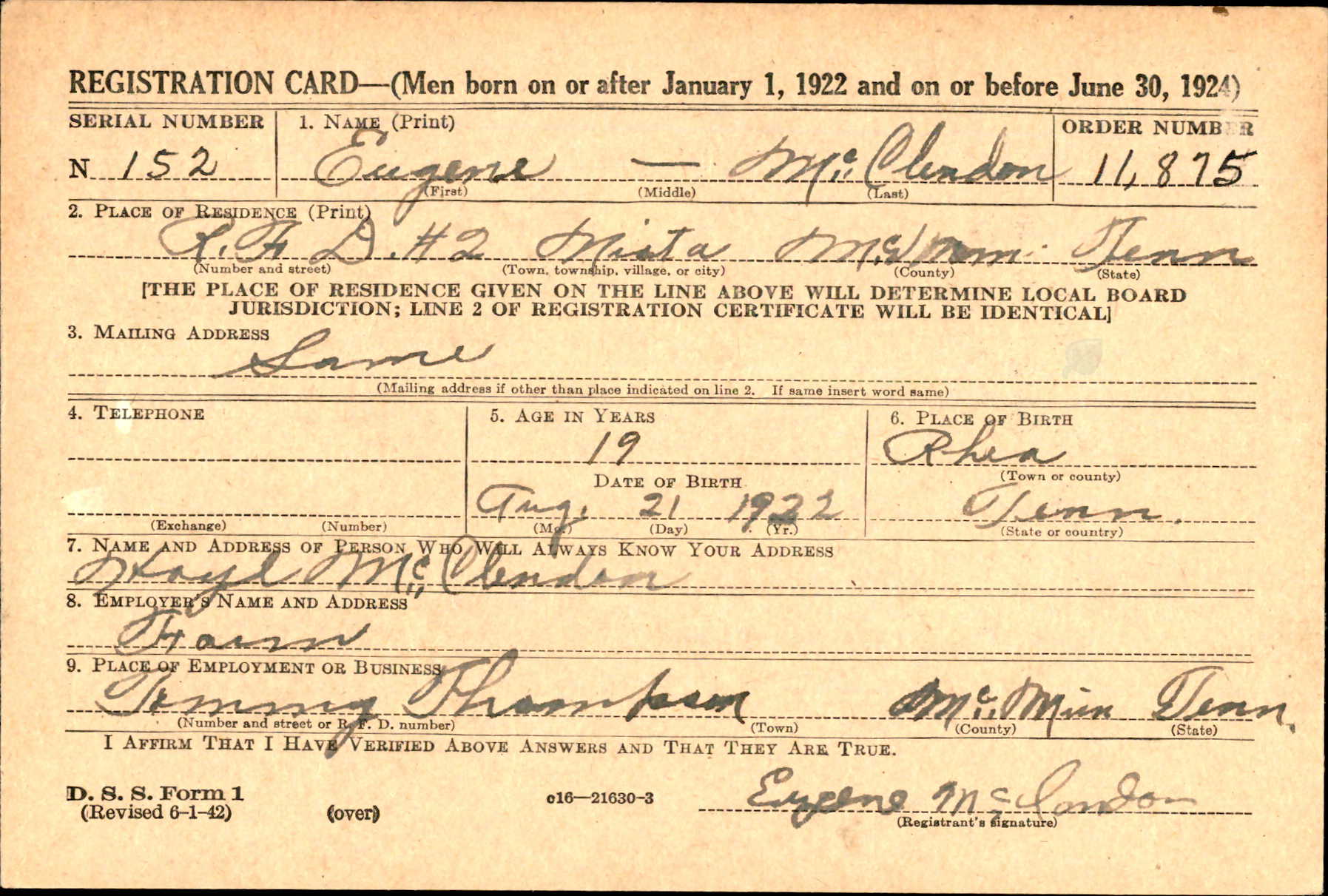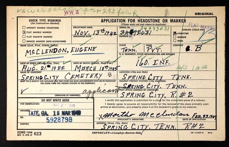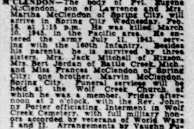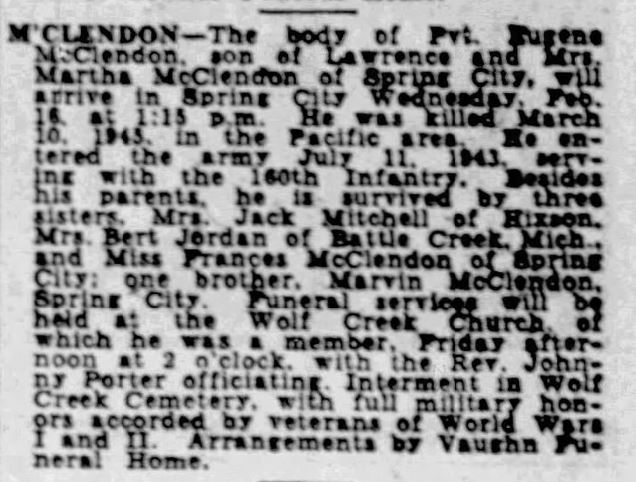 Eugene “Gene” McClendon was born 21 August 1922 to Lawrence McClendon and Martha Pelfrey. He enlisted in the Army July 11, 1943. He Died non Battle 10 March 1945 in the Pacific area. He was survived by his parents, three sisters and one brother.