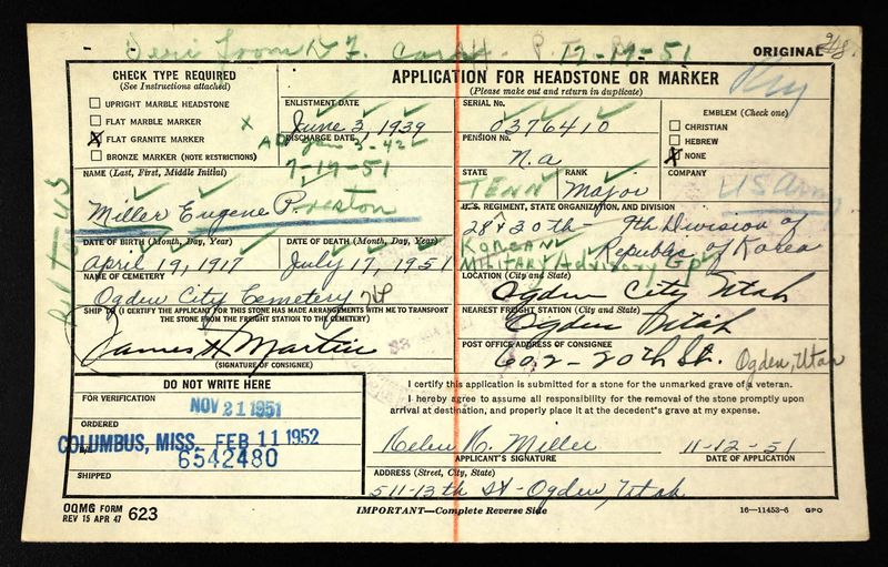 Major Miller was a member of the 8202nd Army Unit, Korean Military Assistance Group (KMAG). He developed hemorrhagic fever and was taken to the 121st Evacuation Hospital where he died. He is buried at the Ogden City Cemetery, Ogden City, Utah.
