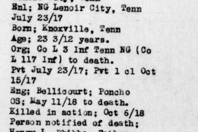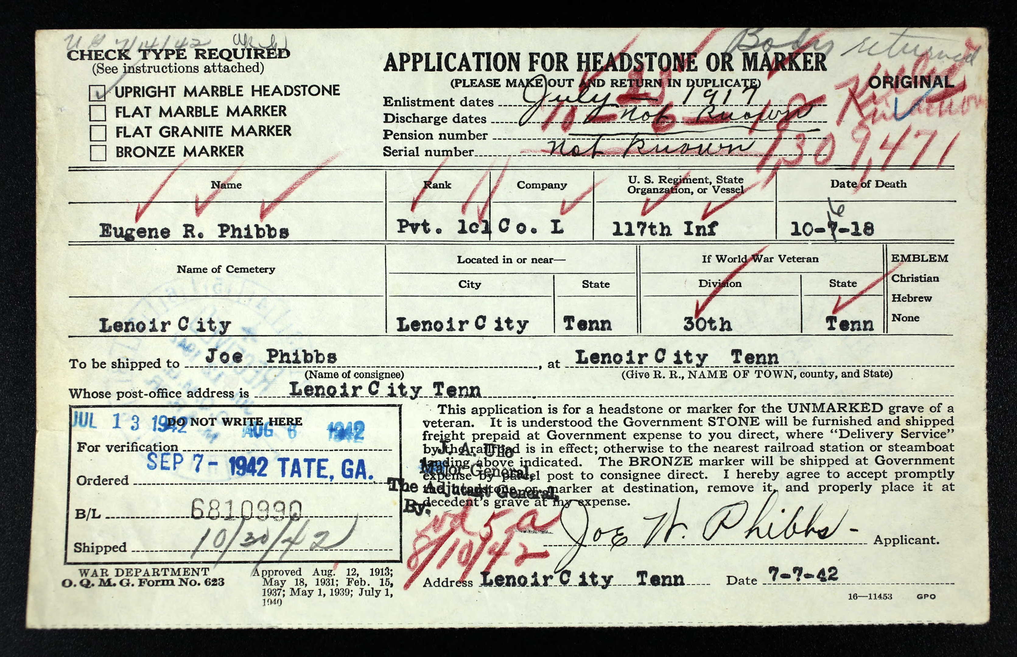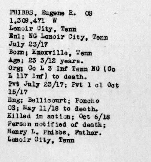 Private First Class Phibbs served with the 117th Infanty, 30th Division and was killed in action on October 6, 1918.