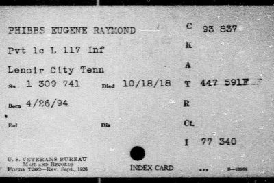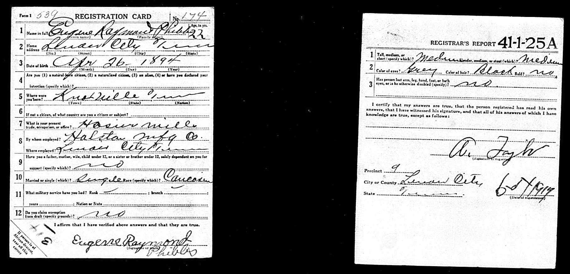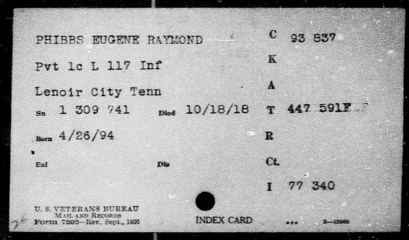 Eugene Raymond Phibbs was born in Knoxville, Tennessee on April 26, 1894. Prior to answering the call of his nation, he was employed at Holston manufacturing Company in Loudon, Tennessee. He was never married.