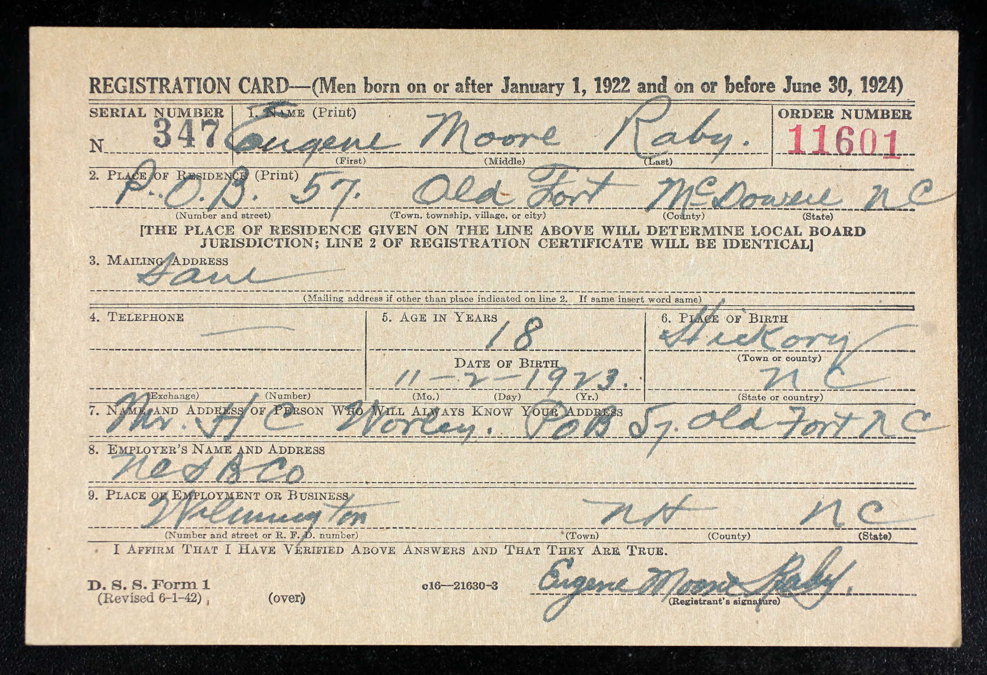 Eugene Moore Raby was born on 2 November 1923 at Hickory, North Carolina, the son of S.R. Raby and Mamie Hamshaw.