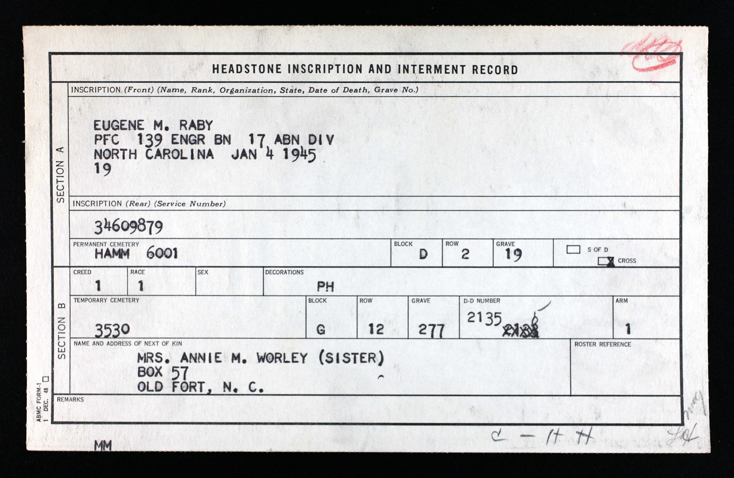 Eugene Raby was initially buried at Grand Failly Cemetery at Longuyon, France and reburied at Luxembourg American Cemetery, Luxembourg City, Luxembourg, D, 2, 19