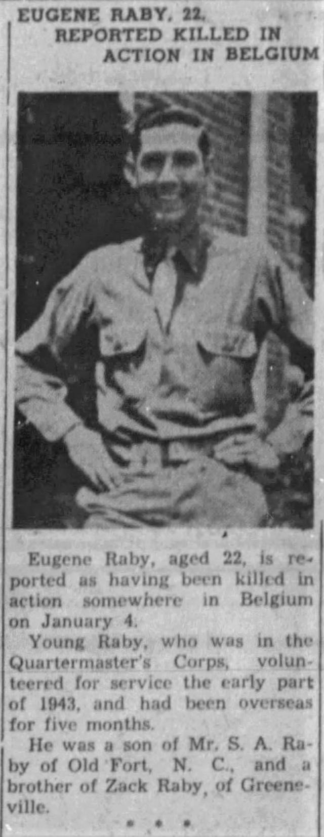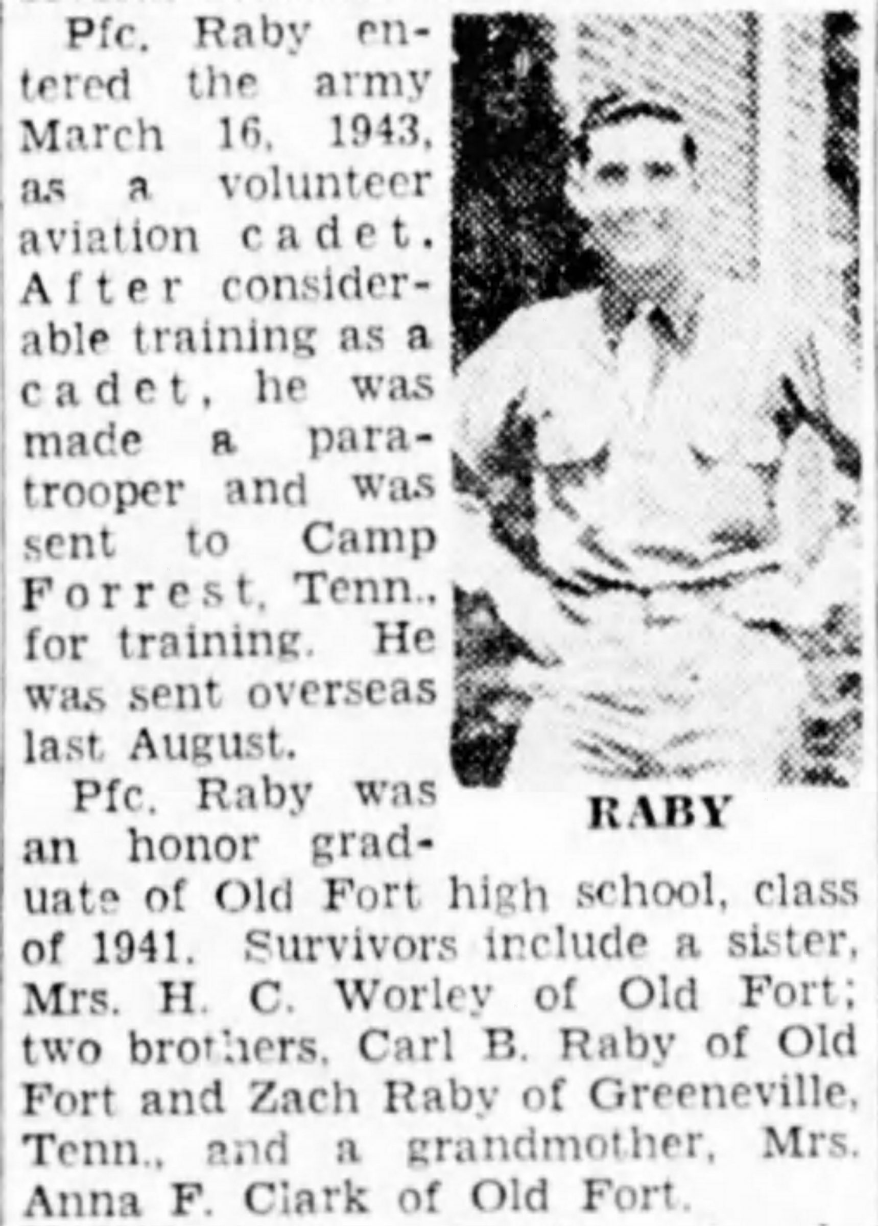 Paratrooper Eugene M. Raby of Old Fort was killed in action in Belgium on January 4th, according to word received from the war department. He enlisted in the army in February, 1943, was accepted as a cadet flyer, and sent to Rhode Island State College for nine months. When Army Cadet training was discontinued he volunteered for the paratroopers and was sent to England in August, 1944. Pvt. Raby, one of McDowell County’s promising young ment, had a host of friends both of Old Fort and Marion. He graduated from Old Forth High school as valedictorian of his class in 1941. His engagement to Miss Sue Carver of Marion was announced shortly before he left for overseas. Pvt. Raby is survived by his sister, Mrs. H.C. Worley of Old Fort, two brothers, and a grandmother.
