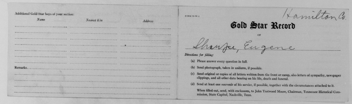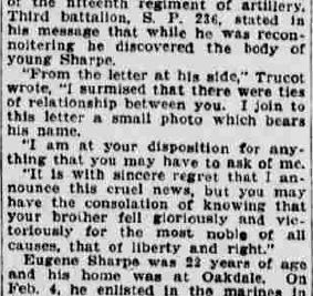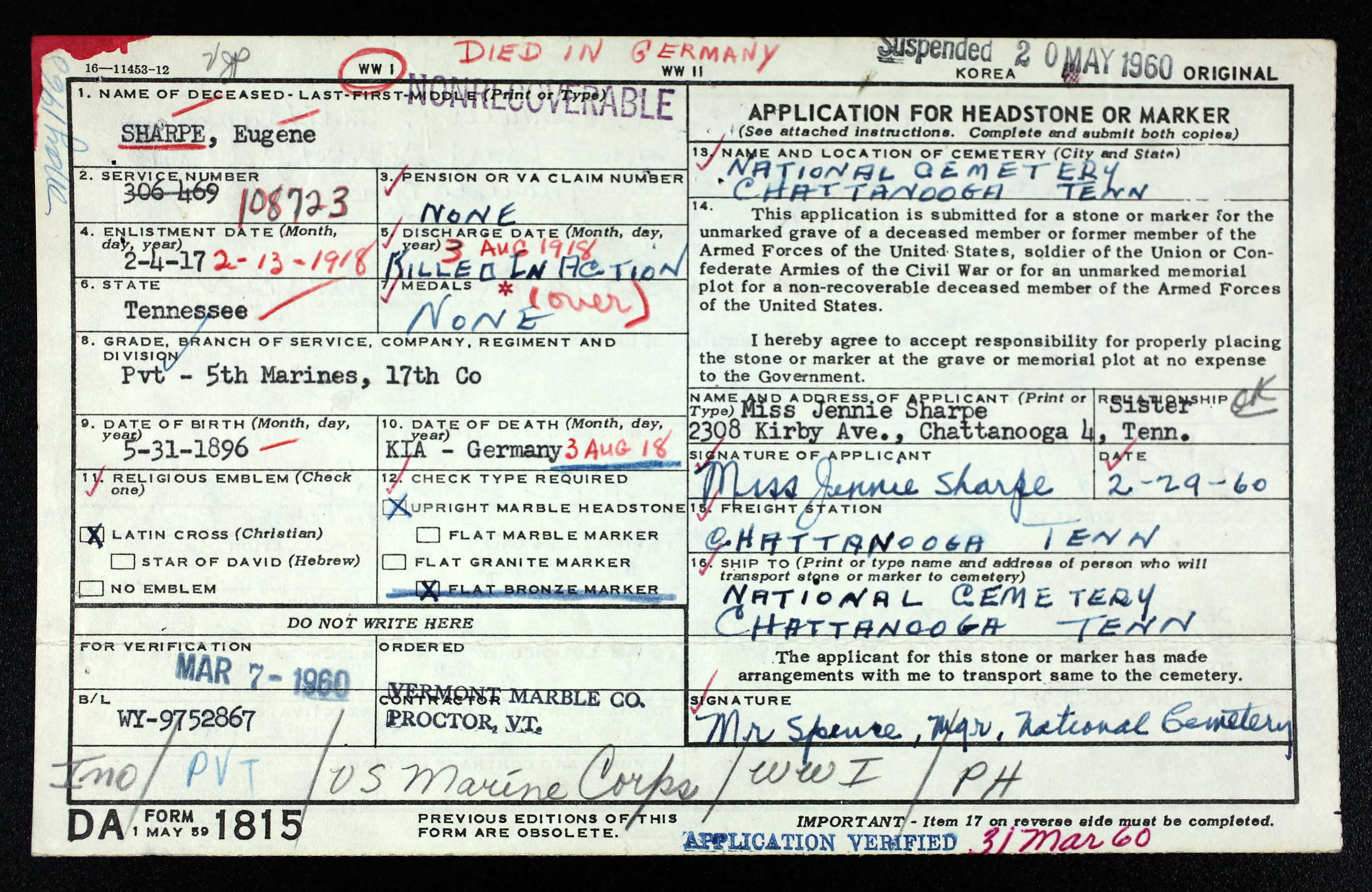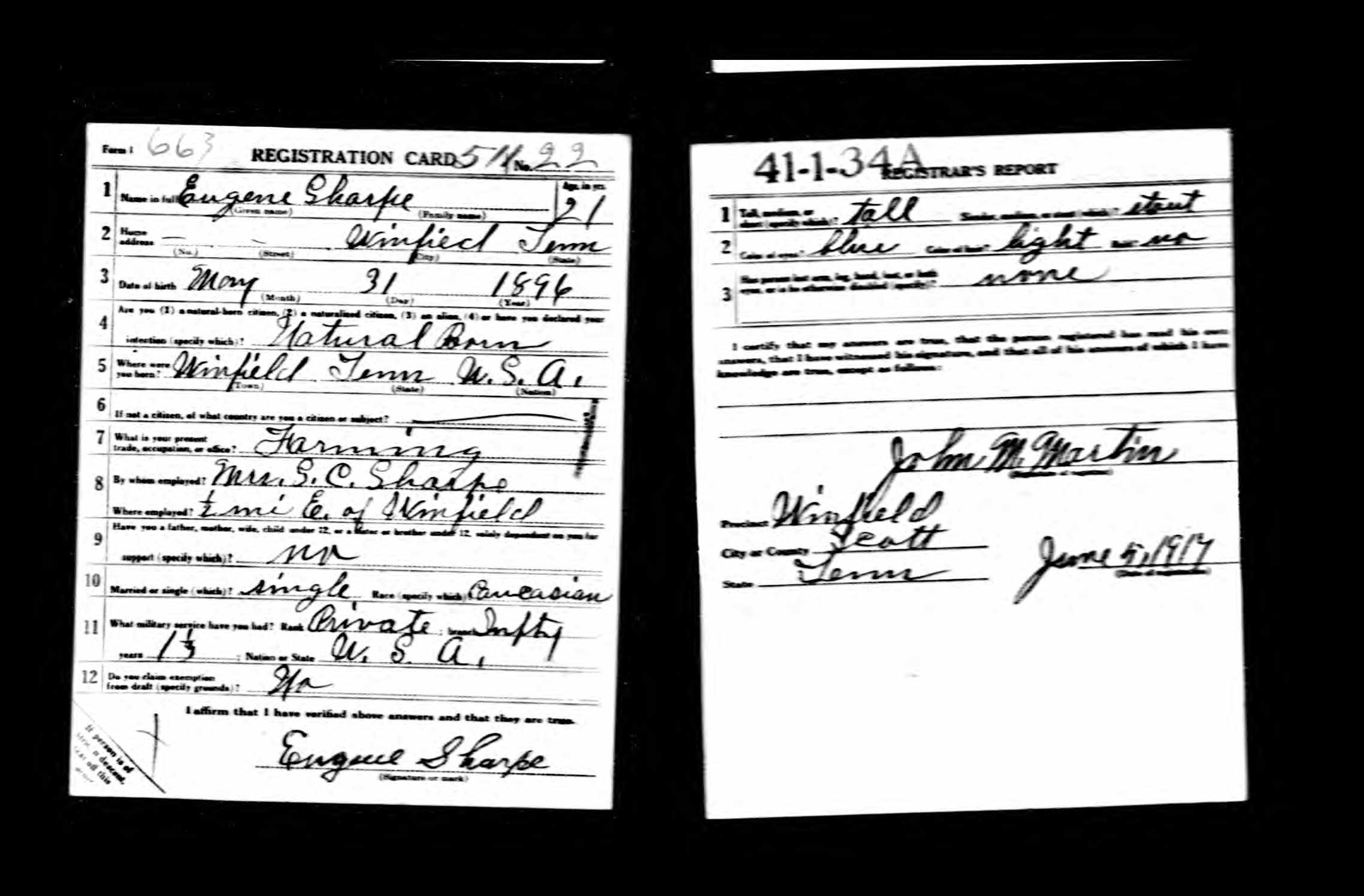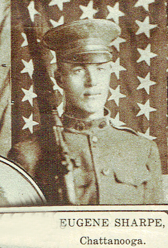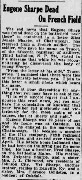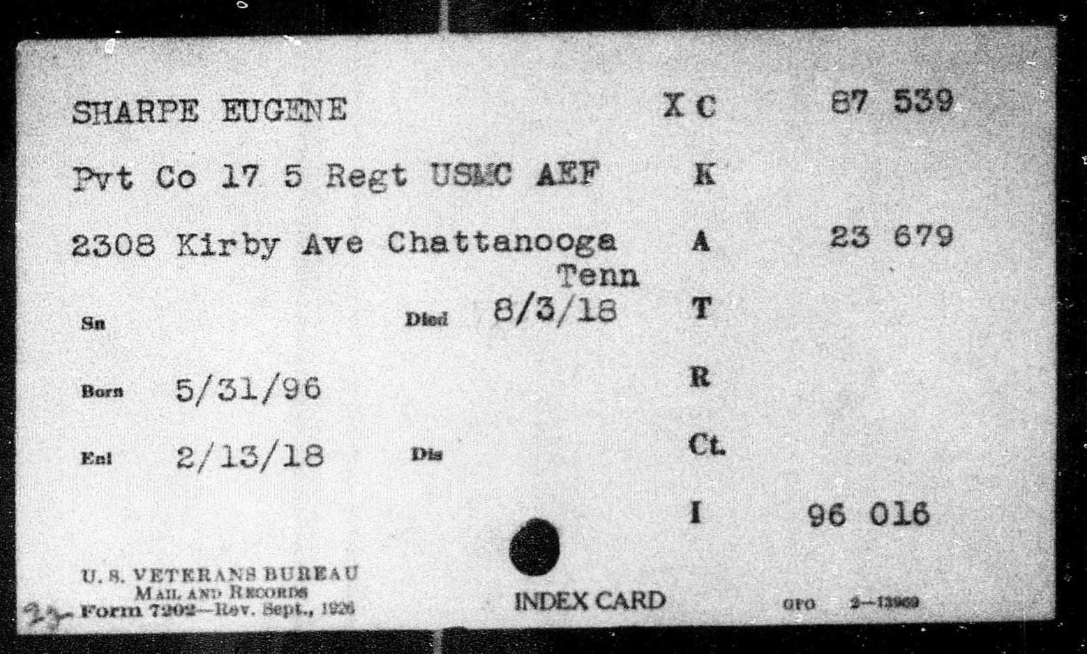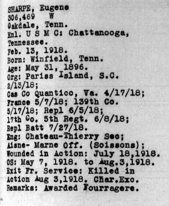 Eugene Sharpe was born on 31 May 1896 in Winfield, Tennessee, son of Sterling G. Sharpe and Delphia Pennington. Prior to his enlistment he was a brakeman on the southern railroad from Danville, Ky. Pvt Sharp died in Germany. He was reported as missing in Action on 3 August 1918 and is commemorated at Aisne-Marne Cemetery, France. Memorialized at Chattanooga National Cemetery.