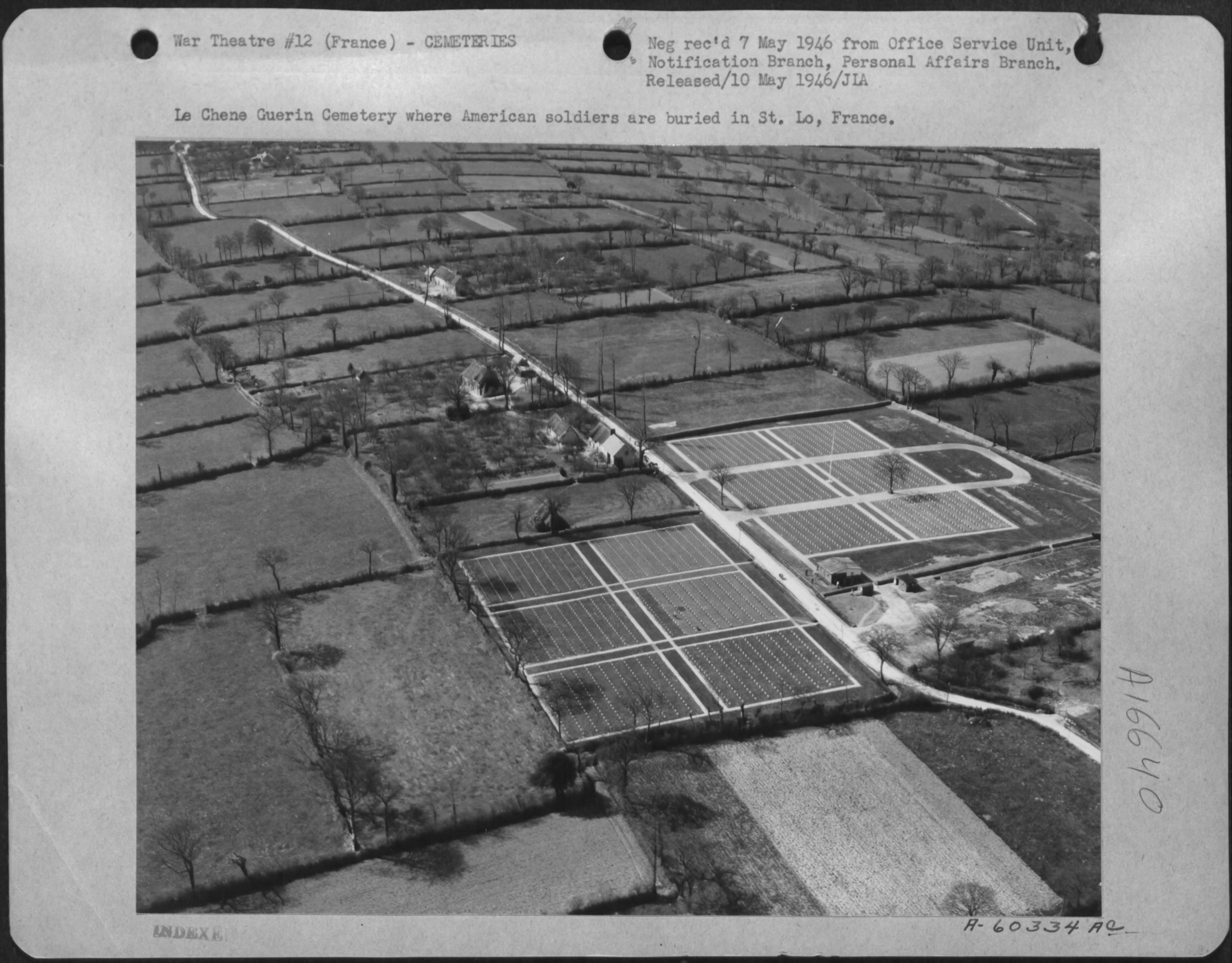 He was initially buried at Le Chêne-Guérin Cemetery at Percy, France and was re-buried at Brittany American Cemetery, St. James (Manche), France, Plot A, Row 10, Grave 5.