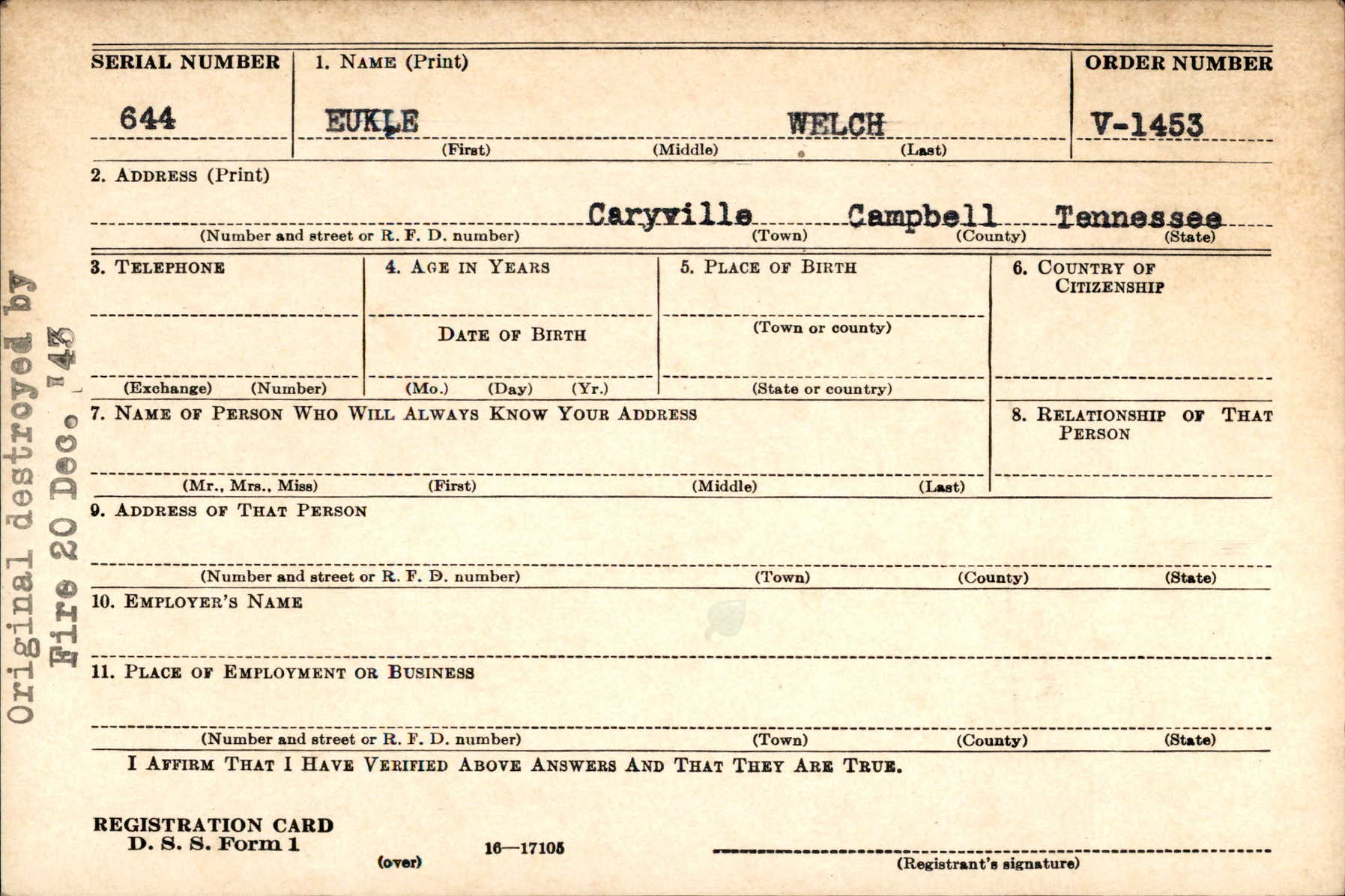 Eukle Welch was born on 11 August 1919, the son of Clyde Welch and Alice Bullock. He was married to Flora Welch.