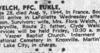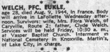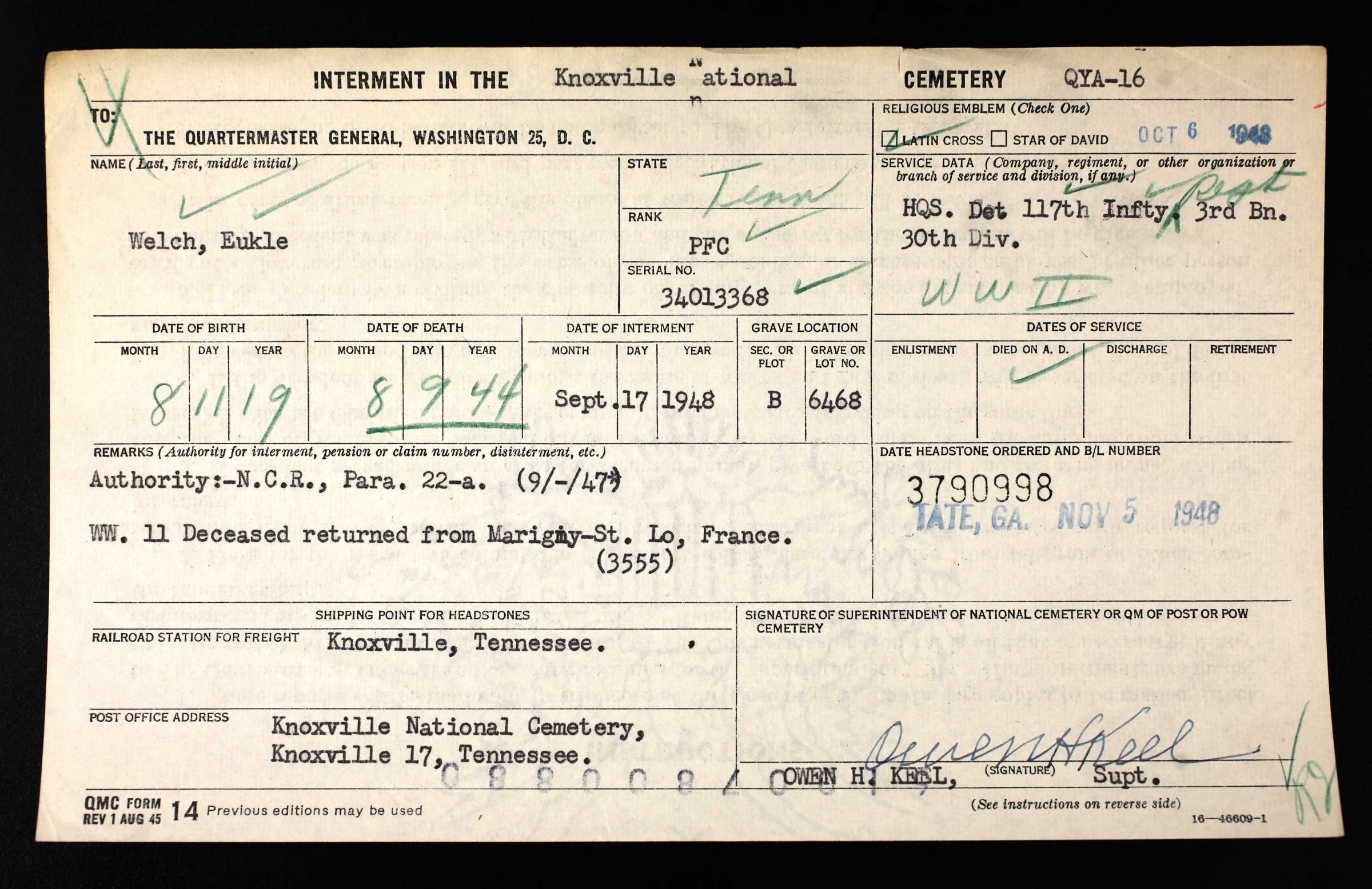 He was killed in action on 9 August 1944 in France. PFC Welch was returned from Marigny – St. Lo in France.