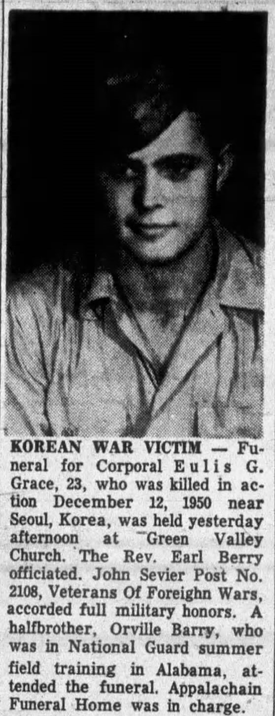 Funeral for Corporal Eulis G. Grace, 23, who was killed in action December 12, 1950 near Seoul Korea, was held yesterday afternoon at Green Valley Church. A half brother, Orville Barry, who was in National Guard summer field training in Alabama, attended the funeral.