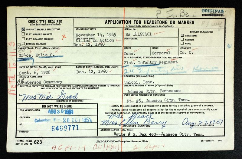 Corporal Grace was a member of the 21st Infantry Regiment, 24th Infantry Division. He was Killed in Action while fighting the enemy in South Korea.