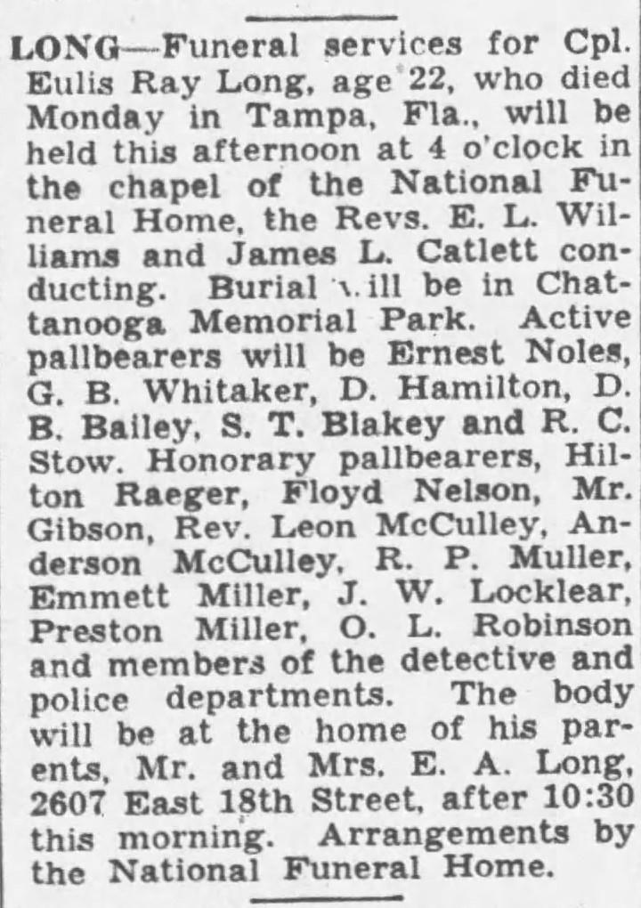 Eulis Ray Long was born on 5 October 1921 at Chattanooga, Tennessee, only child of Eulis Alexander Long and Ida Baker.