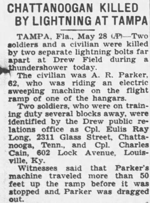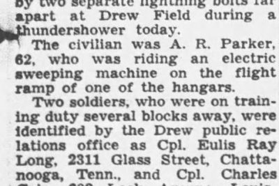 Two soldiers and a civilian were killed by two separate lightning bolts far apart at Drew Field during a thundershower today. The civilian was A.R. Parker, 62, who was riding an electric sweeping machine on the flight ramp of one of the hangars. Two soldiers, who were on training duty several blocks away, were identified by the Drew public relations office as Cpl. Eulis Ray Long, 2311 Glass Street, Chattanooga, Tenn., and Cpl. Charles Cain, 602 Lock Avenue, Louisville, Ky.