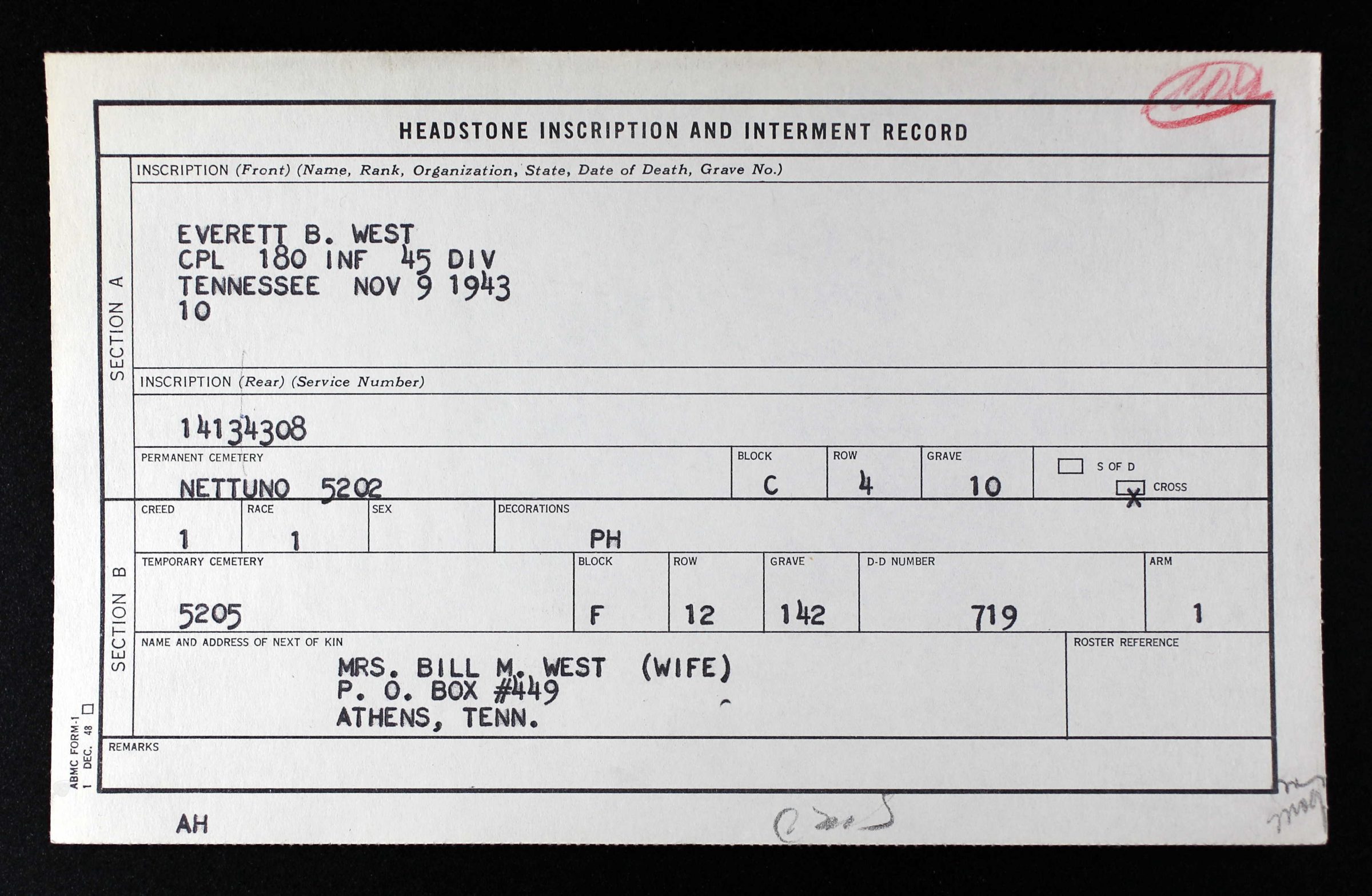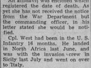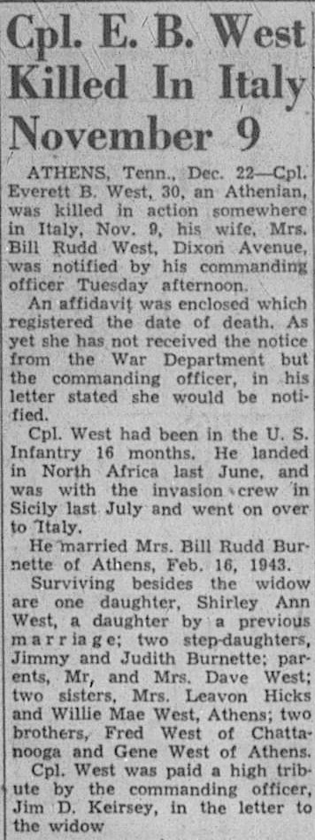 Athens, Tenn., Dec. 22 – Cpl. Everett B. West, 30, an Athenian, was killed in action somewhere in Italy, Nov. 9, his wife, Mrs. Bill Rudd West, Dixon Avenue, was notified by his commanding officer Tuesday afternoon. An affidavit was enclosed which registered the date of death. As yet she has not received the notice from the War Department but the commanding officer, in his letter stated she would be notified. Cpl. West had been in the U.S. Infantry 16 months. He landed in North Africa last June, and was with the invasion crew in Sicily last July and went on over to Italy. He married Mrs. Bill Rudd Burnette of Athens, Feb. 16, 1943. Surviving besides his widow are one daughter, Shirley Ann West, a daughter by a previous marriage; two step-daughters, Jimmy and Judith Burnette; parents, Mr. and Mrs. Dave West; two sisters, Mrs. Leavon Hicks and Willie Mae West, Athens; two brothers, Fred West of Chattanooga and Gene West of Athens. Cpl. West was paid a high tribute by the commanding officer, Jim D. Keirsey, in the letter to the widow.