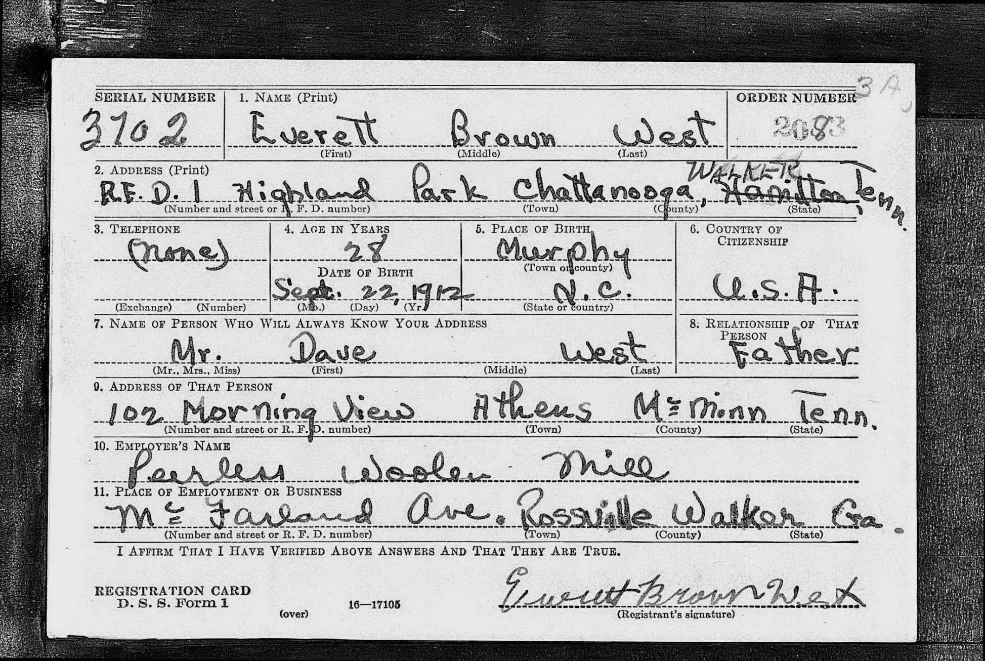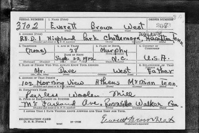 Everett Brown West was born in Murphy, North Carolina to David Crockett West and Callie Missouri Holden. He was first married to Dollie McKeehan. Later he married Nancy Walker and they had a daughter together, Shirley Ann West. In 1943 he married Bill Rudd Burnette. Everett West entered the service on 17 August 1942 at Camp Forrest in Tennessee. He was killed in action in Italy, initially buried at Avellino Cemetery at Avellino, Italy and reburied at Sicily-Rome American Cemetery, Nettuno, Italy, C, 4, 10