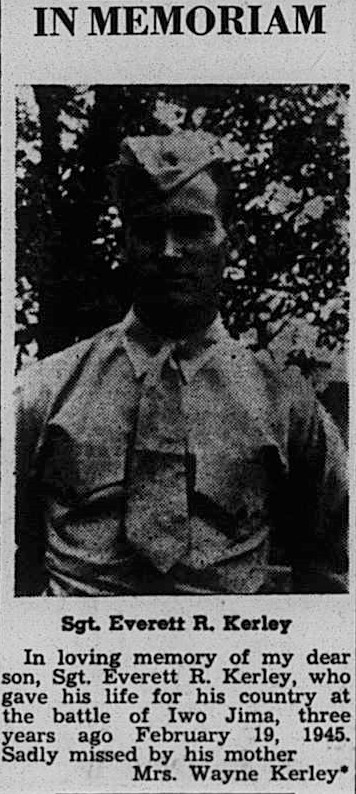 In loving memory of my dear son, Sgt. Everett R. Kerley, who gave his life for his country at the battle of Iwo Jima, three years ago February 19, 1945. Sadly missed by his mother, Mrs. Wayne Kerley