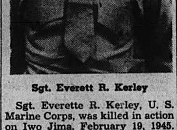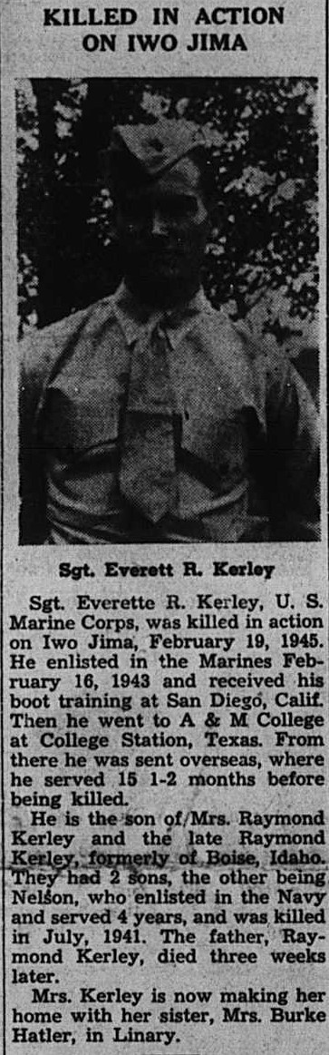 Sgt. Everette R. Kerley, U.S. Marine Corps, was killed in action on Iwo Jima, February 19, 1945. He enlisted in the Marines February 16, 1943 and received his boot training at San Diego, Calif. Then he went to A&M College at College Station, Texas. From there he was sent overseas, where he served 15 months before being killed. He is the son of Mrs. Raymond Kerley and the late Raymond Kerley, formerly of Boise, Idaho. They had 2 sons, the other being Nelson, who enlisted in the Navy and served 4 years, and was killed in July, 1941. The father, Raymond Kerley, died three weeks later. Mrs. Kerley is now making her home with her sister, Mrs. Burke Hatler, in Linary.