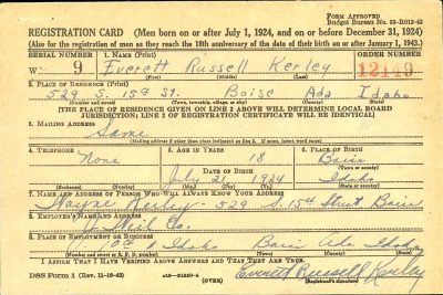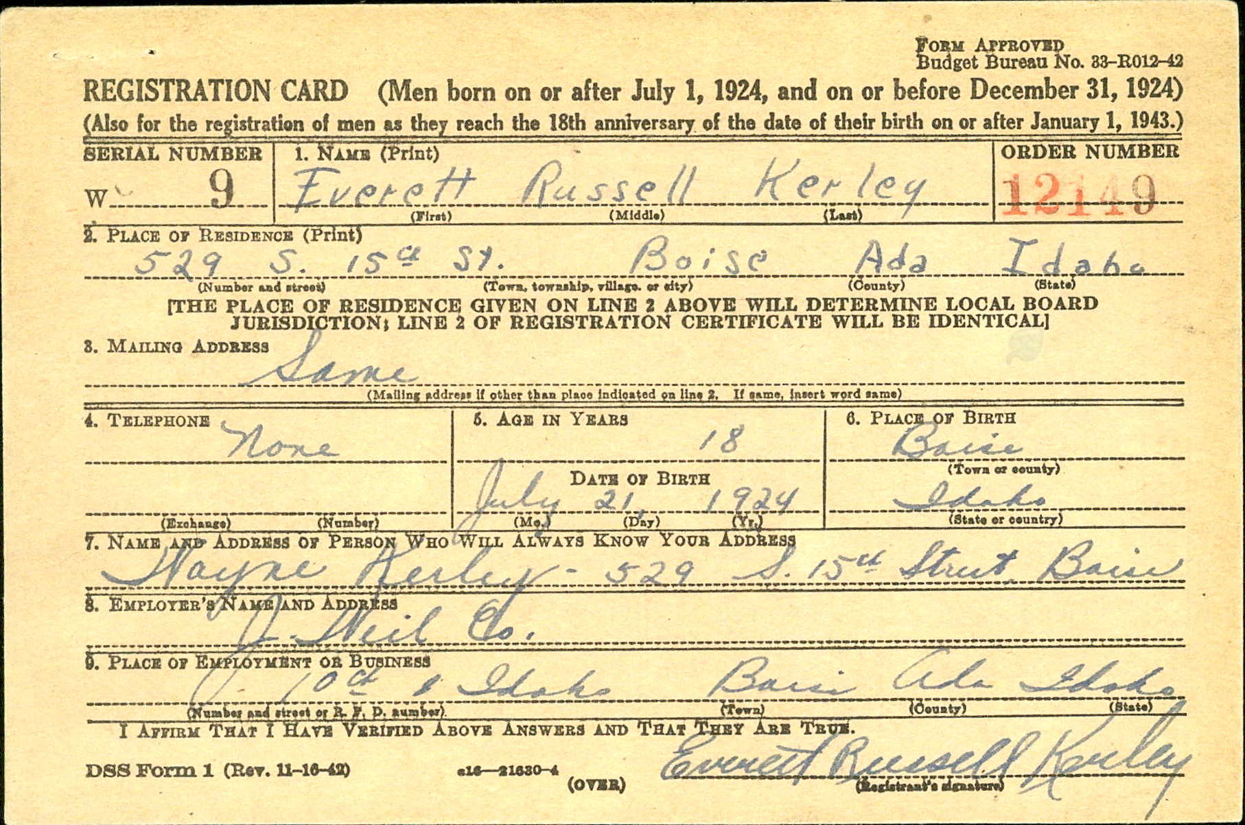 Everett Russell Kerley was born on 21 July 1924 at Boise, Idaho, the son of Raymond Kerley and Wayne Manning. He attended Boise High School at Boise, Idaho in 1942.