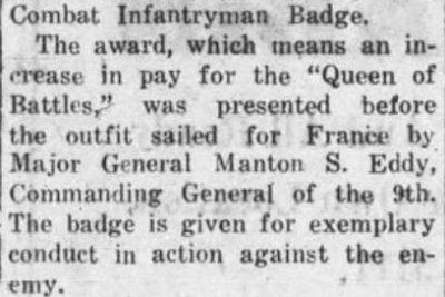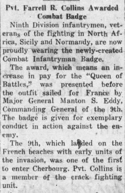 Ninth Division infantrymen, veterans of the fighting in North Africa, Sicily and Normandy, are now proudly wearing the newly-created Combat Infantryman Badge. The award, which means an increase in pay for the “Queen of Battles,” was presented before the outfit sailed for France by Major General Manton S. Eddy, Commanding General of the 9th. The badge is given for exemplary conduct in action against the enemy. The 9th, which landed on the French beaches with early units of the invasion, was one of the first to enter Cherbourg. Pvt. Collins is a member of the crack fighting unit.