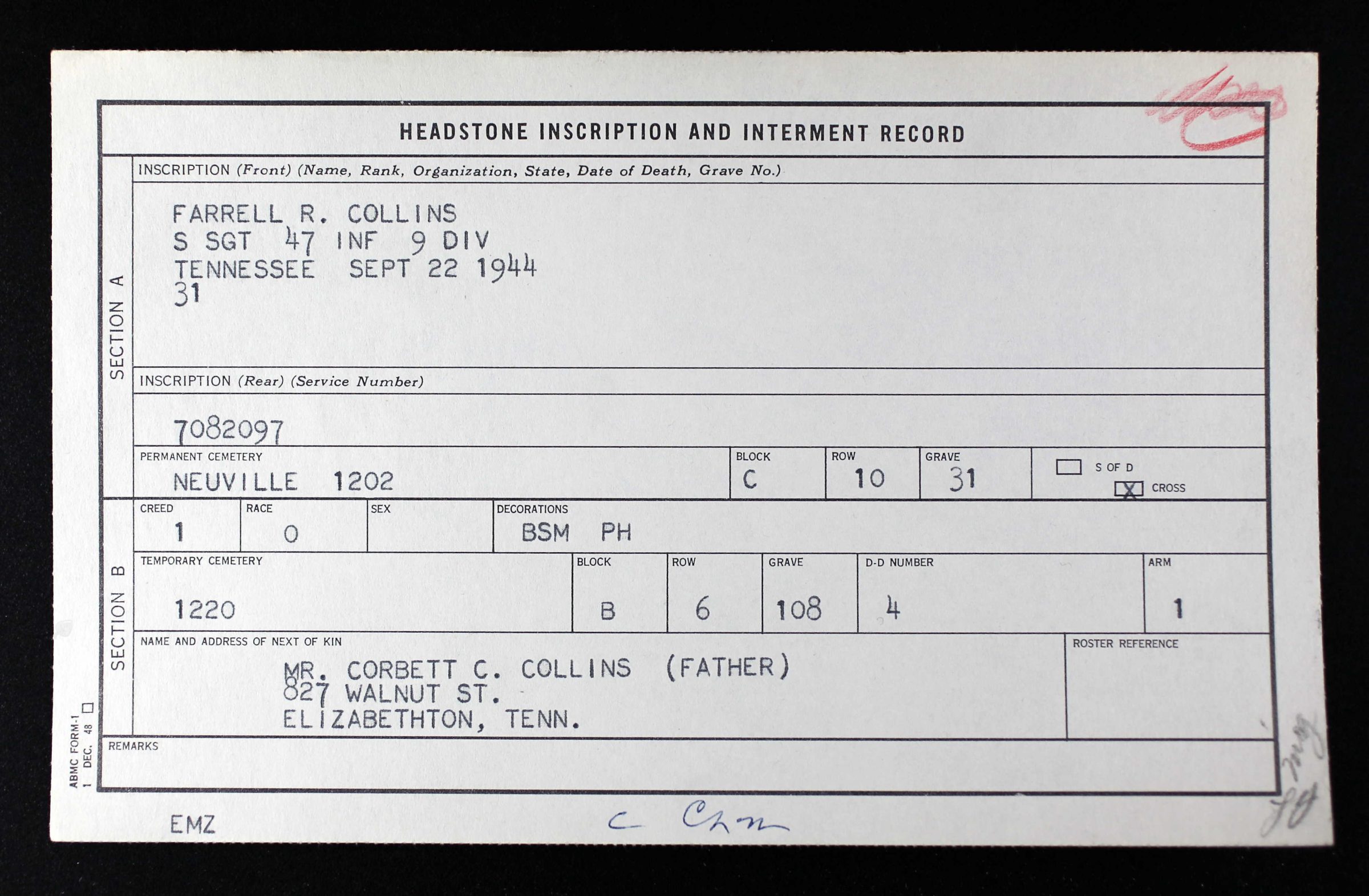 He was assigned to the 47th Infantry Regiment, 9th Infantry Division. The 9th landed at Normandy across Utah beach on 10th of June 1944, (D-Day +4). It then cut across the Cotentin Peninsula, and helped to liberate the port city of Cherbourg, France from the German defenders. Following a rest in July, the 9th attacked the defenses at St-Lo and then moved in to close the Falaise Gap. Continuing with its momentum, it crossed the Marne. It begins the campaign into the area of Saarlautern Germany. It was here that Staff Sergeant Collins was killed in action.