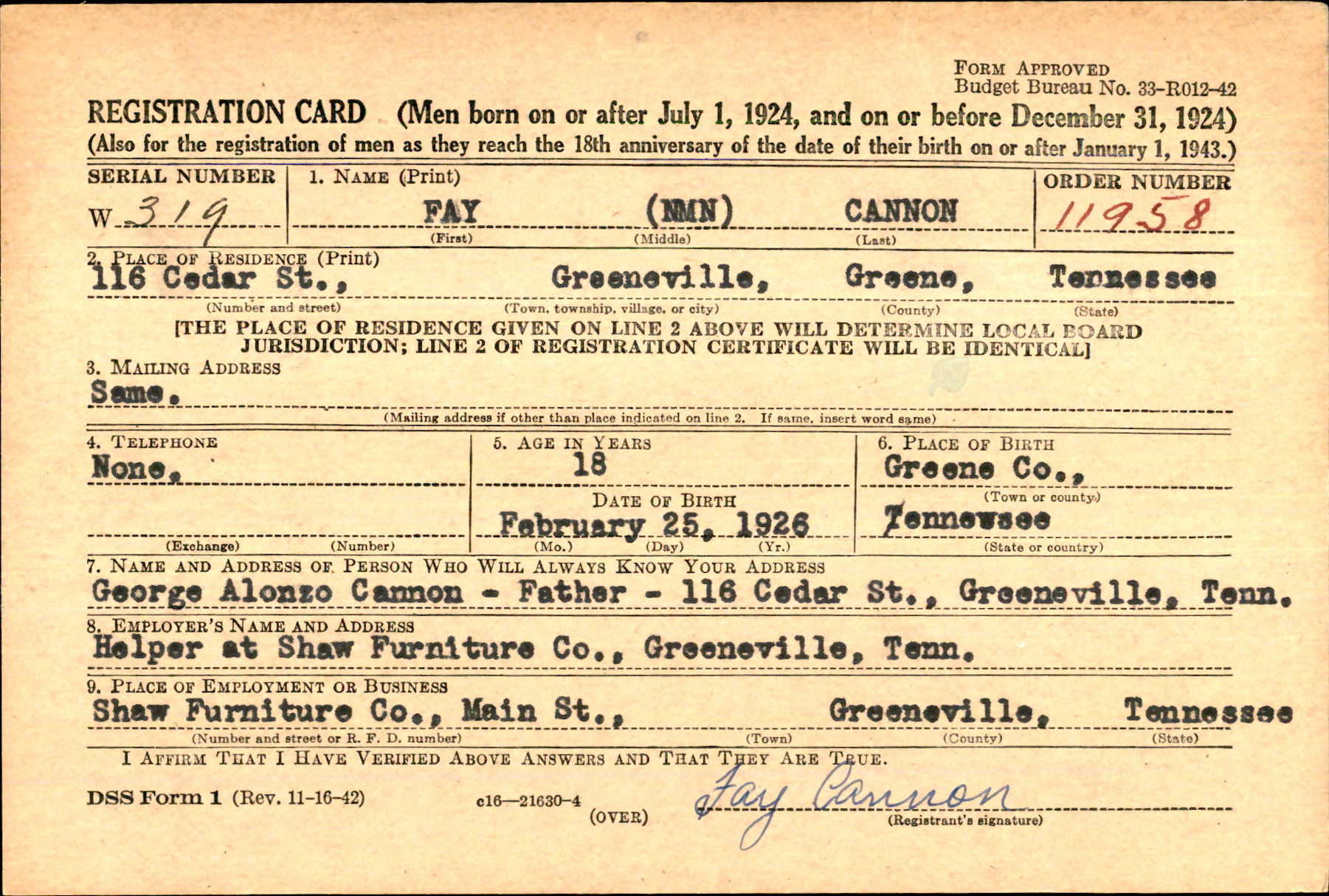 Pvt Cannon was Killed in Action on 25 December 1944 and is remembered on the Tablets of the Missing, Normandy American Cemetery, Colleville-sur-Mer, France. His last letter home dated December 21, 1944 read in part, “Don’t worry, and we’ll all be home soon to stay.” The body of the 18 year old was never found.