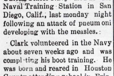 Funeral services for Finis Chesley Clark, 17, were conducted from the Camp Ground Church by the Rev. Geo. Davenport and Rev. Carl Davis of Erin. Young Clark, who was serving as an apprentice seaman with the United States Navy, died at the Naval Training Station in San Diego, Calif., last Monday night following an attack of pneumonia developing with the measles. Clark volunteered in the Navy about seven weeks ago and was completing his boot training. He was born and reared in Houston County attending school in Erin. Surviving are his parents, Mr. and Mrs. John Clark, of the Camp Ground community; three brothers, Cpl. James Clark stationed in the Army in Deleware, Ewing of Detroit; and Hugh of Erin; two sisters, Mrs. Walker Claxton and Miss Nellie Clark, both of Erin. Burial was in Cedar Hill.