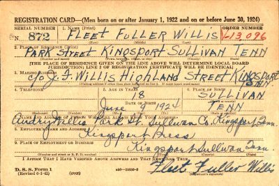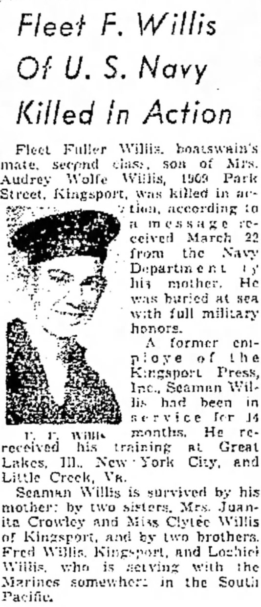 Fleet Fuller Willis, boatswain´s mate second class, son of Mrs. Audrey Wolfe Willis, 1909 Park Street, Kingsport, was killed in action according to a message received March 22, from the Navy Department by his mother. He was buried at sea with full military honors.
