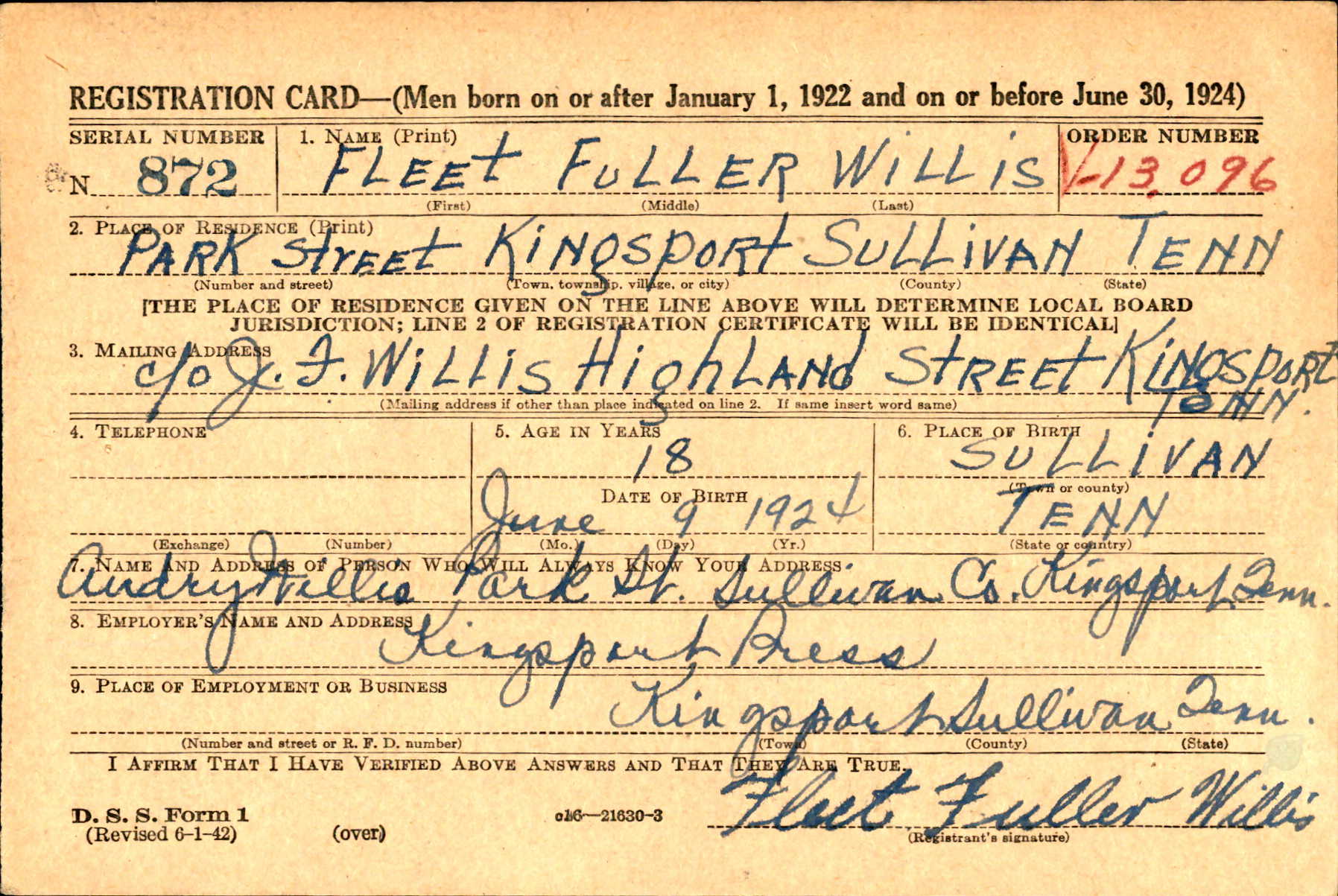Fleet Fuller Willis was born in Sullivan, Tennessee. He was the son of Mack Clell Willis and Audrey V. Wolfe.