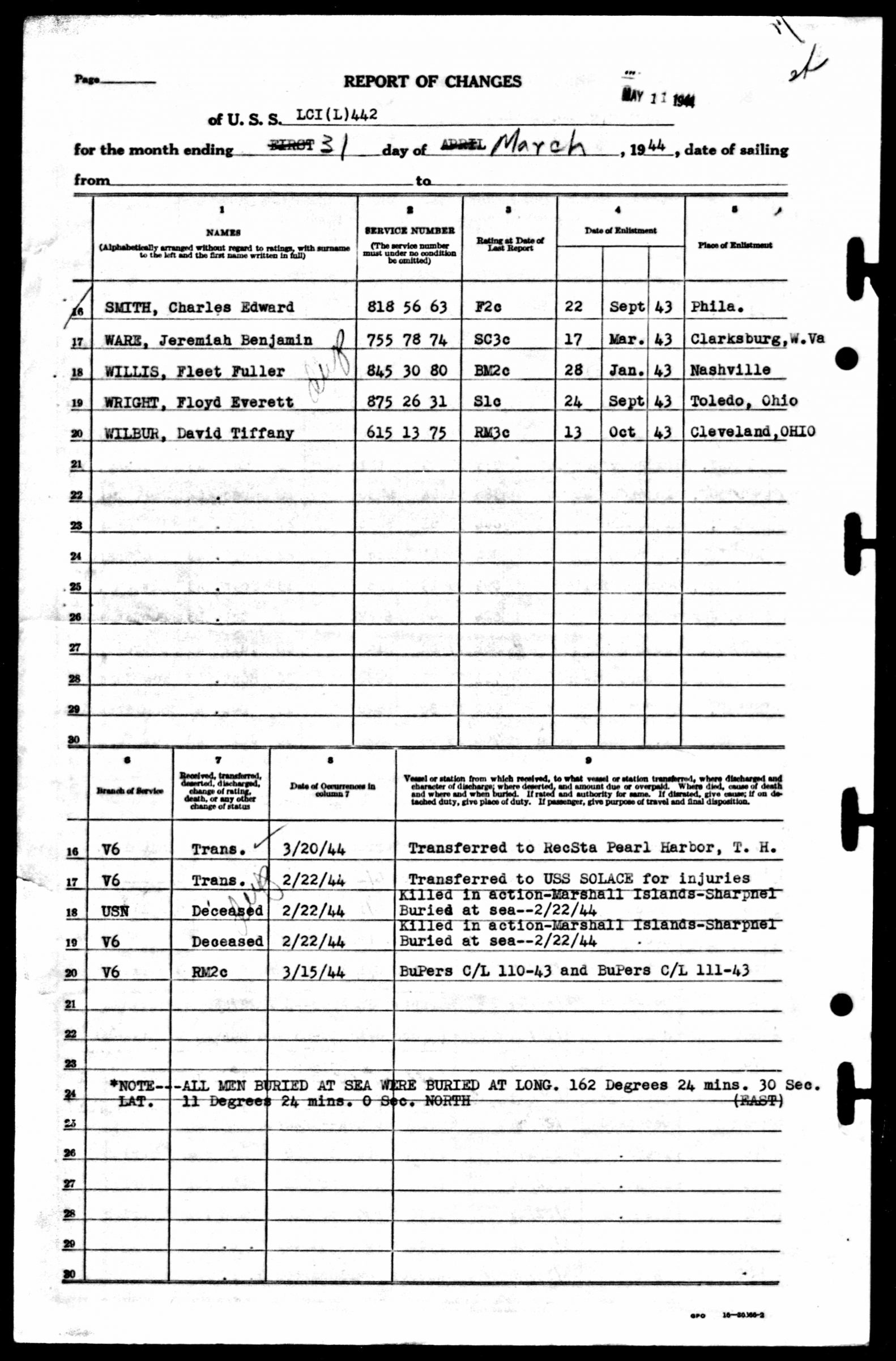 He served on the U.S.S. LCI(L) 442. He was killed in action near the Marshall Islands-Sharpnel. Buried at sea. He is memorialized at Honolulu.