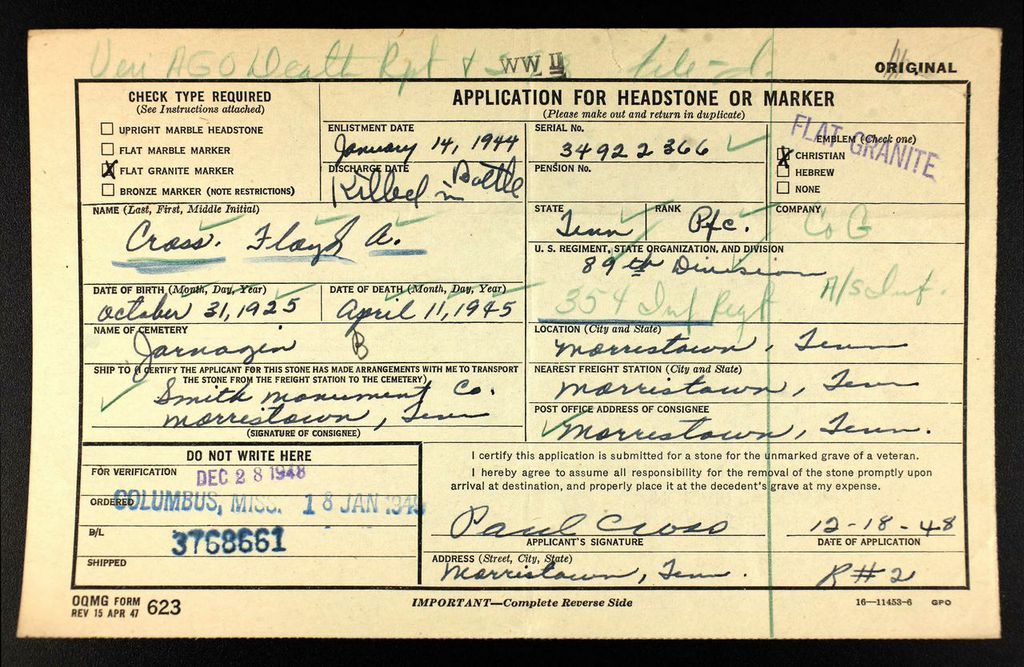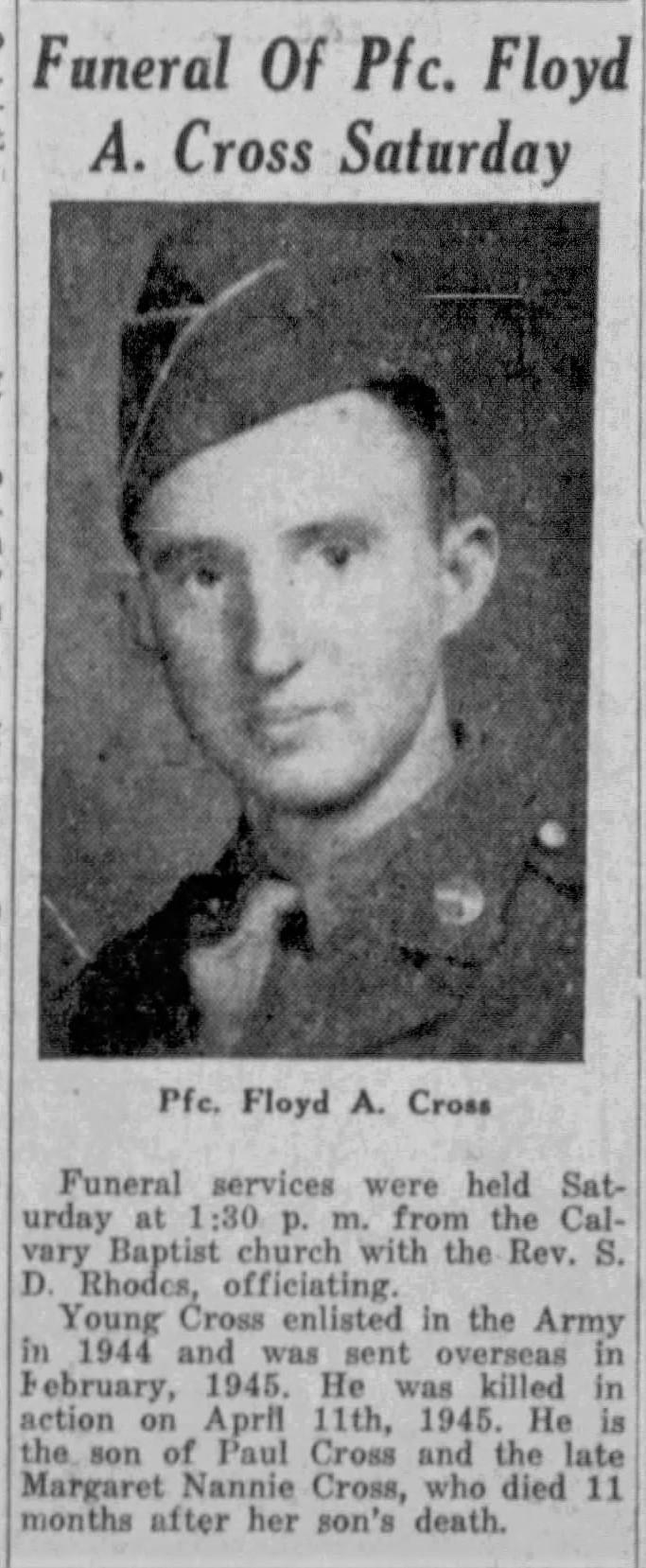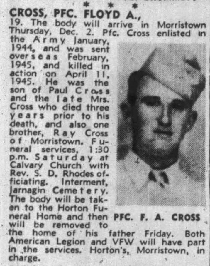 Pfc. Floyd A. Cross, 19. The body will arrive in Morristown Dec. 2. Pfc. Cross enlisted in the Army January, 1944 and was sent overseas February, 1945, and killed in action on April 11, 1945. He was the son of Paul Cross and the late Mrs. Cross who died 11 months after her son’s death, and also one brother, Ray Cross of Morristown.