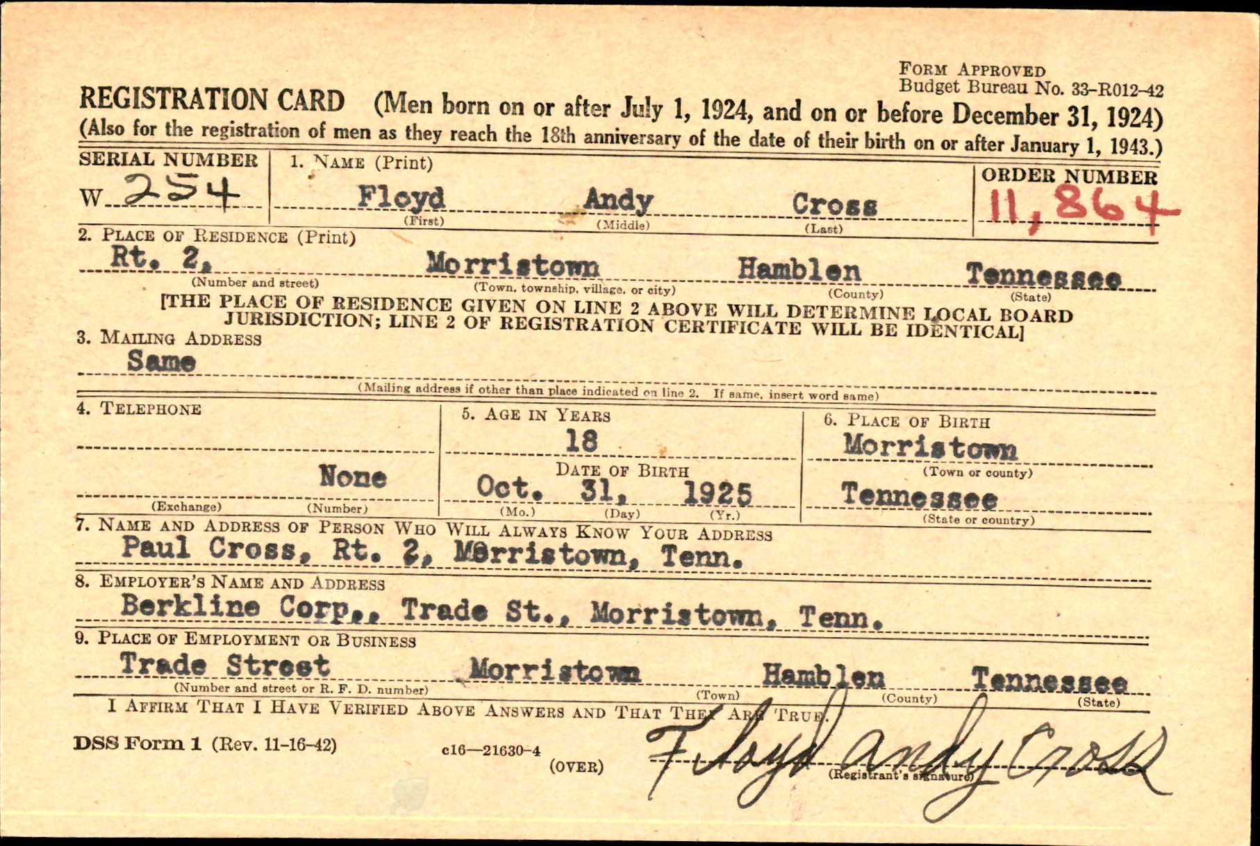 Floyd Andy Cross was born on 31 October 1925 at Morristown, Tennessee, to Paul Dee Cross and Margaret Nannie Pettigrew.