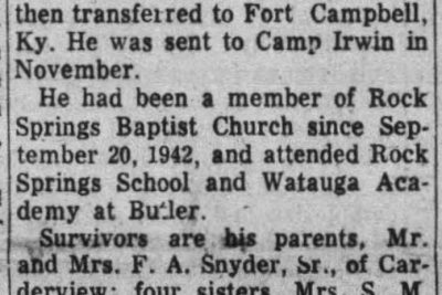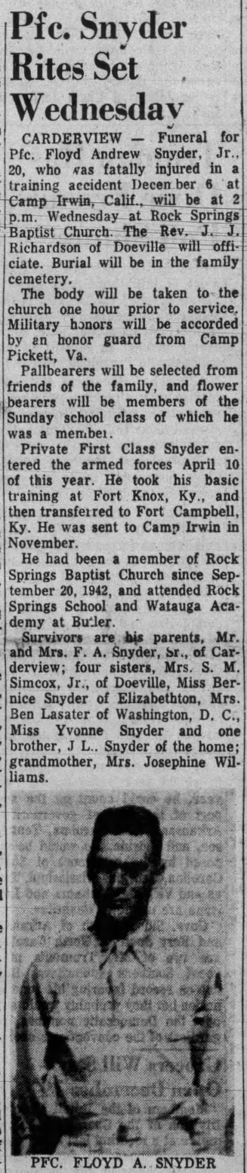 Survivors are his parents, Mr. and Mrs. F.A. Snyder, Sr., of Carderview; four sisters, Mrs. S.M. Simcox Jr., of Doeville, Miss Bernice Snyder of Elizabethton, Mrs. Ben Lasater of Washington, D.C., Miss Yvonne Snyder and one brother, J.L. Snyder of the home; grandmother, Mrs. Josephine Williams.