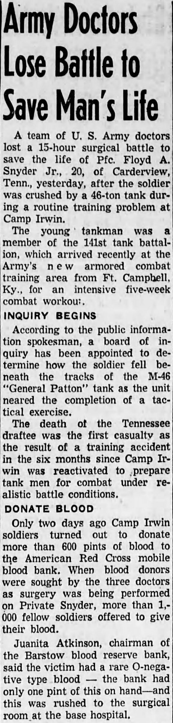 Army Doctors lose battle to save man’s life. A team of U.S. Army Doctors lost a 15-hour surgical battle to save the life of Pfc. Floyd A. Snyder Jr., 20, of Carderview, Tenn., yesterday, after the soldier was crushed by a 46-ton tank during a routine training problem at Camp Irwin.