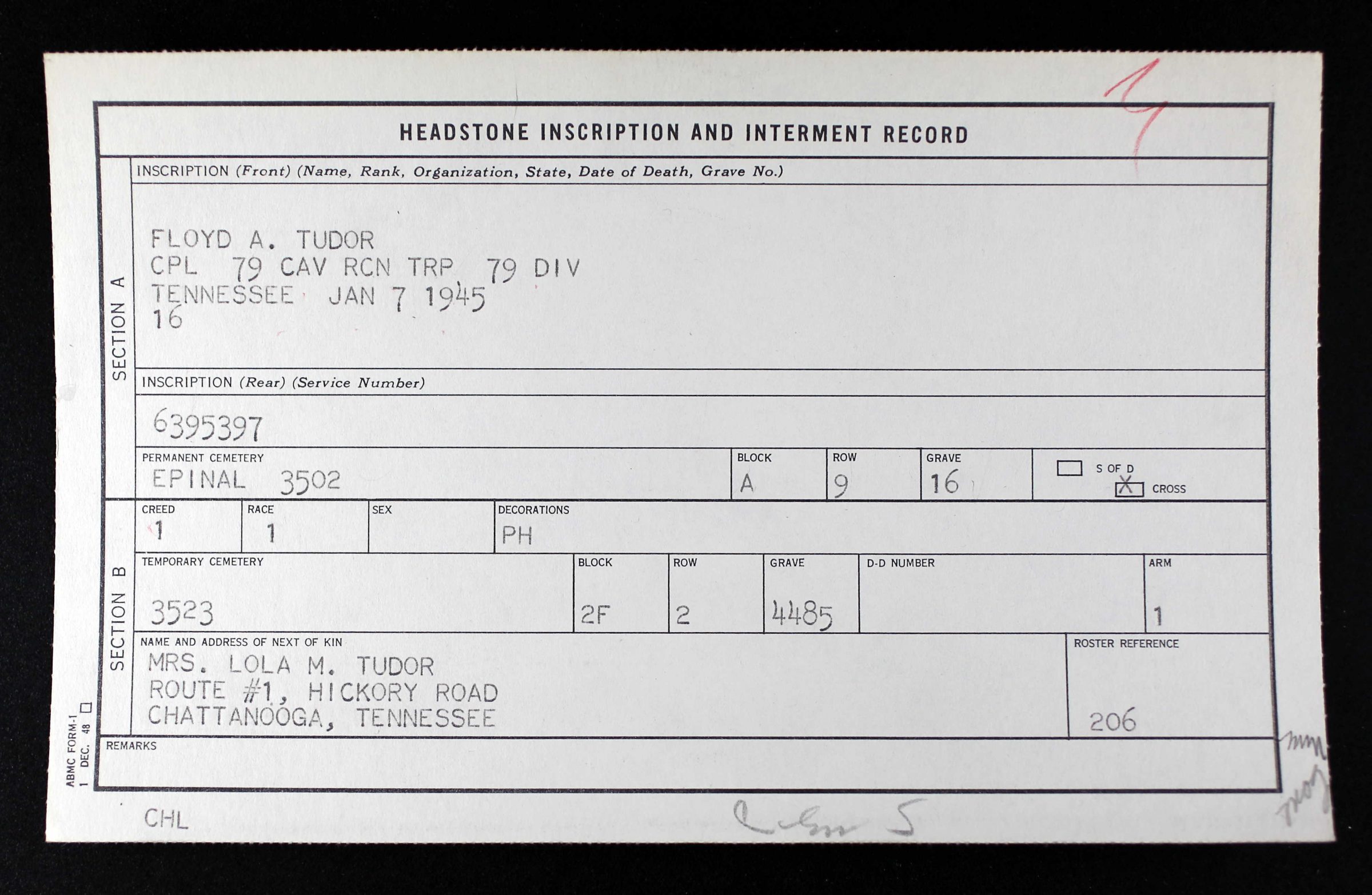 Floyd A. Tudor was born in 1917, the son of Aubrey Tudor and Dora Lavender. His mother died in 1924 of tuberculosis, his father in 1927 and his brother Homer O. Tudor in 1941, also of tuberculosis. Floyd Tudor enlisted in the Sixth cavalry at Fort Oglethorpe in 1936.