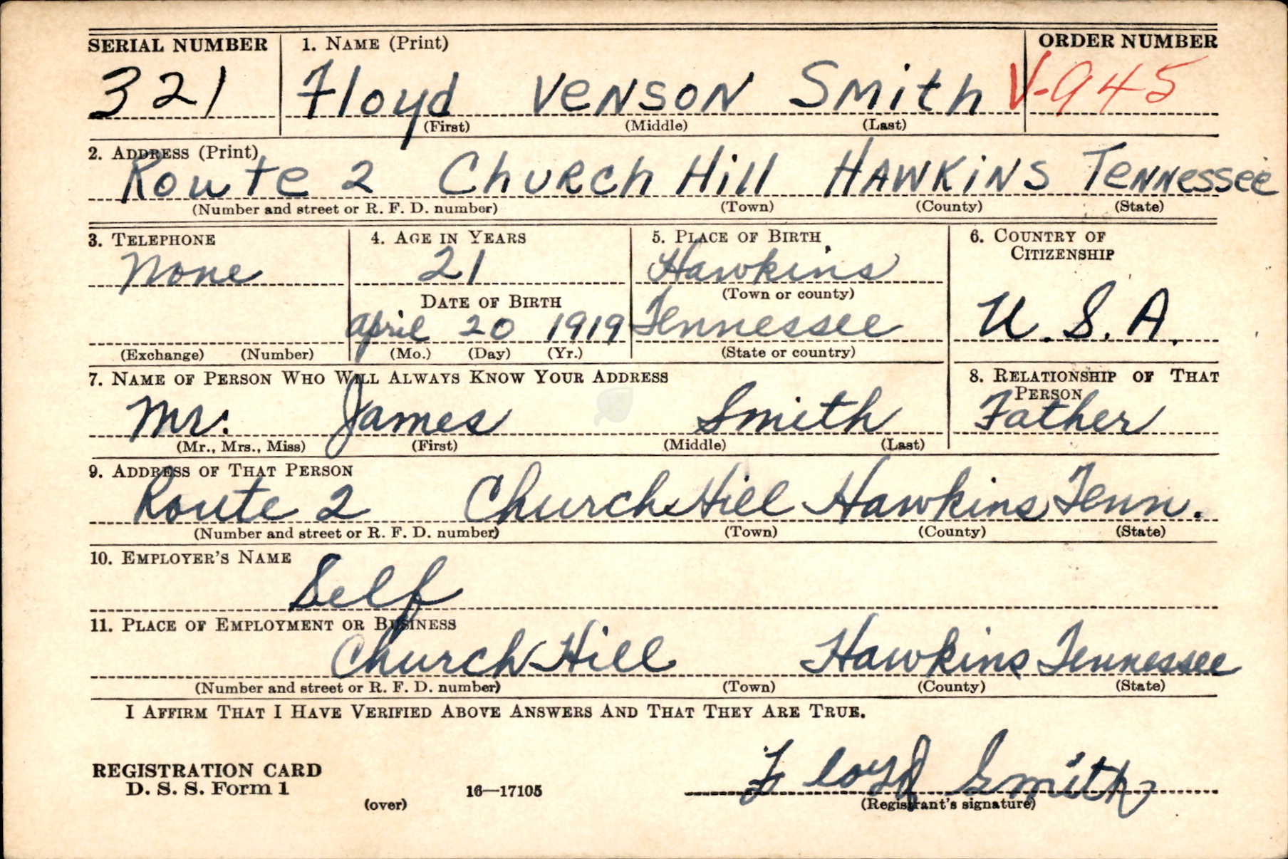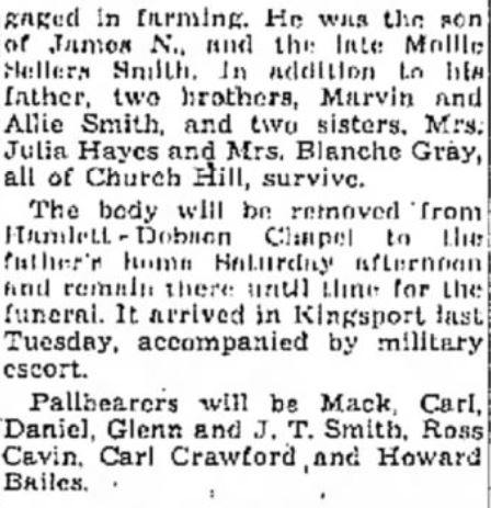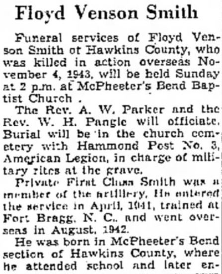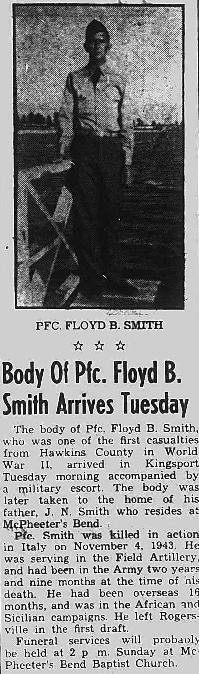 Funeral services of Floyd Benson Smith of Hawkins County, who was killed in action overseas November 4, 1943, will be held Sunday at 2 p.m. at McPheeter’s Bend Baptist Church. The Rev. A. W. Parker and the Rev. W. H. Pangle will officiate. Burial will be in the church cemetery with Hammond Post No. 3, American Legion, in charge of military rites at the grave. Private First Class Smith was a member of the artillery. He entered the service in April, 1941, trained at Fort Bragg, N. C., and went overseas in August, 1942. He was born in McPheeter’s Bend section of Hawkins County, where he attended school and later engaged in farming. He was the son of James N., and the late Mollie Sellers Smith, in addition to his father, two brothers, Marvin and and Allie Smith, and two sisters, Mrs. Julia Hayes and Mrs. Blanche Gray, all of Church Hill, survive. The body will be removed from Hamlett-Dobson Chapel to the father’s home Saturday afternoon and remains there until time for the the funeral. It arrived in Kingsport last Tuesday, accompanied by military escort. Pallbearers will be Mack, Carl, Daniel, Glenn and J. T. Smith, Ross Cavin, Carl Crawford, and Howard Bailes.