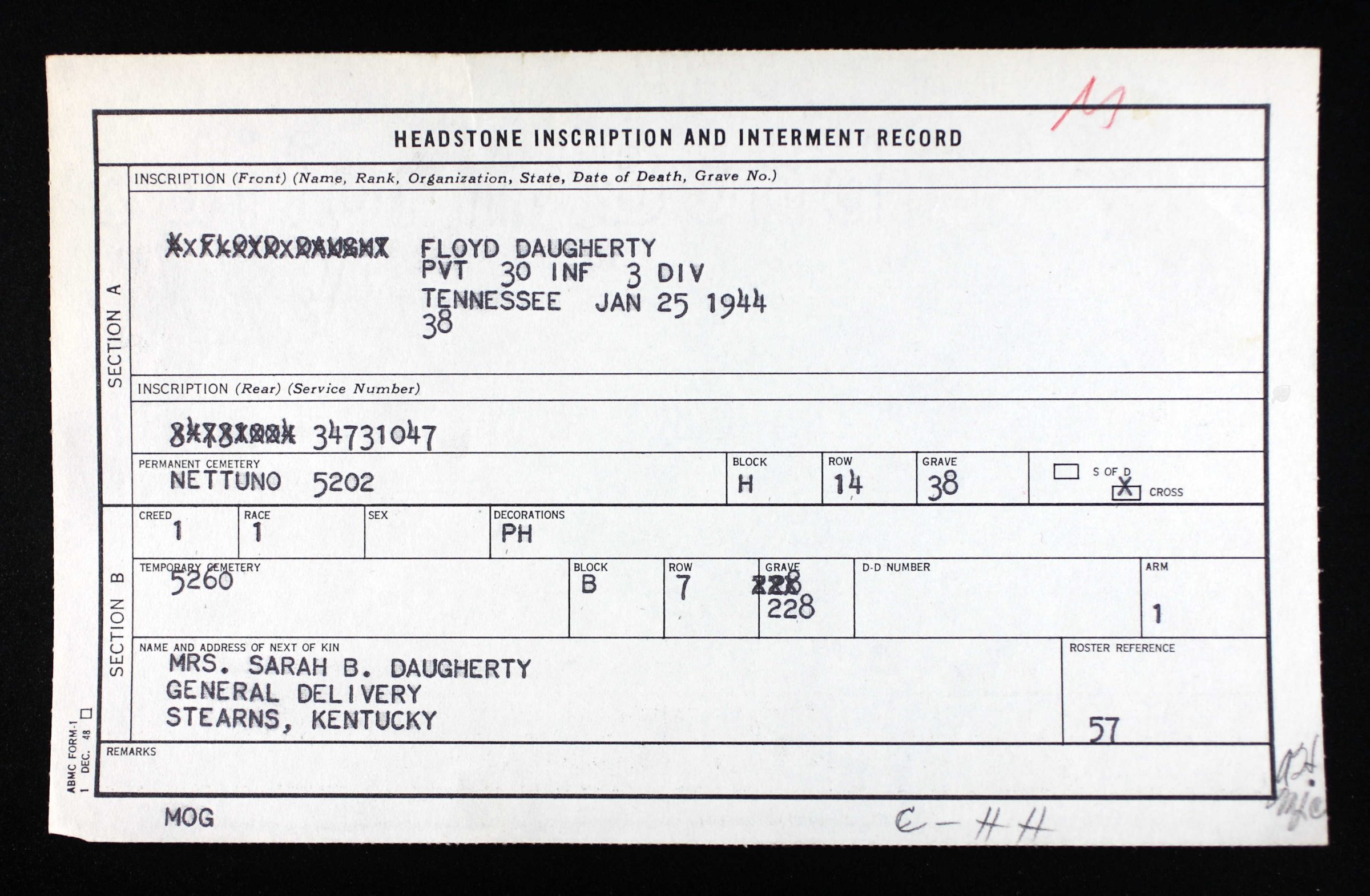 Private Daugherty was Killed in Action on 25 January 1944, He was interred at Sicily-Rome American Cemetery, Nettuno, Italy, plot H, row 14, site 38.
