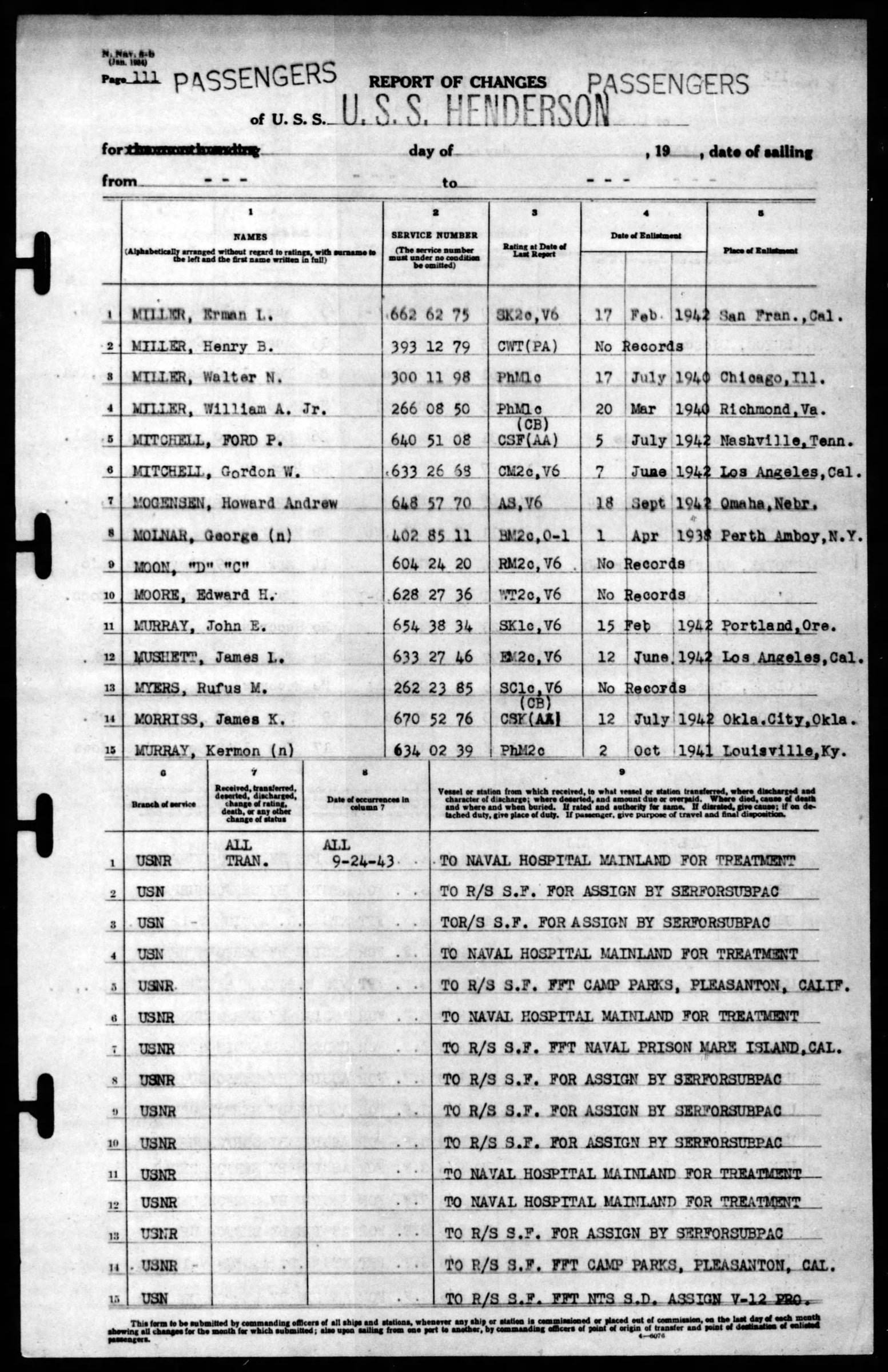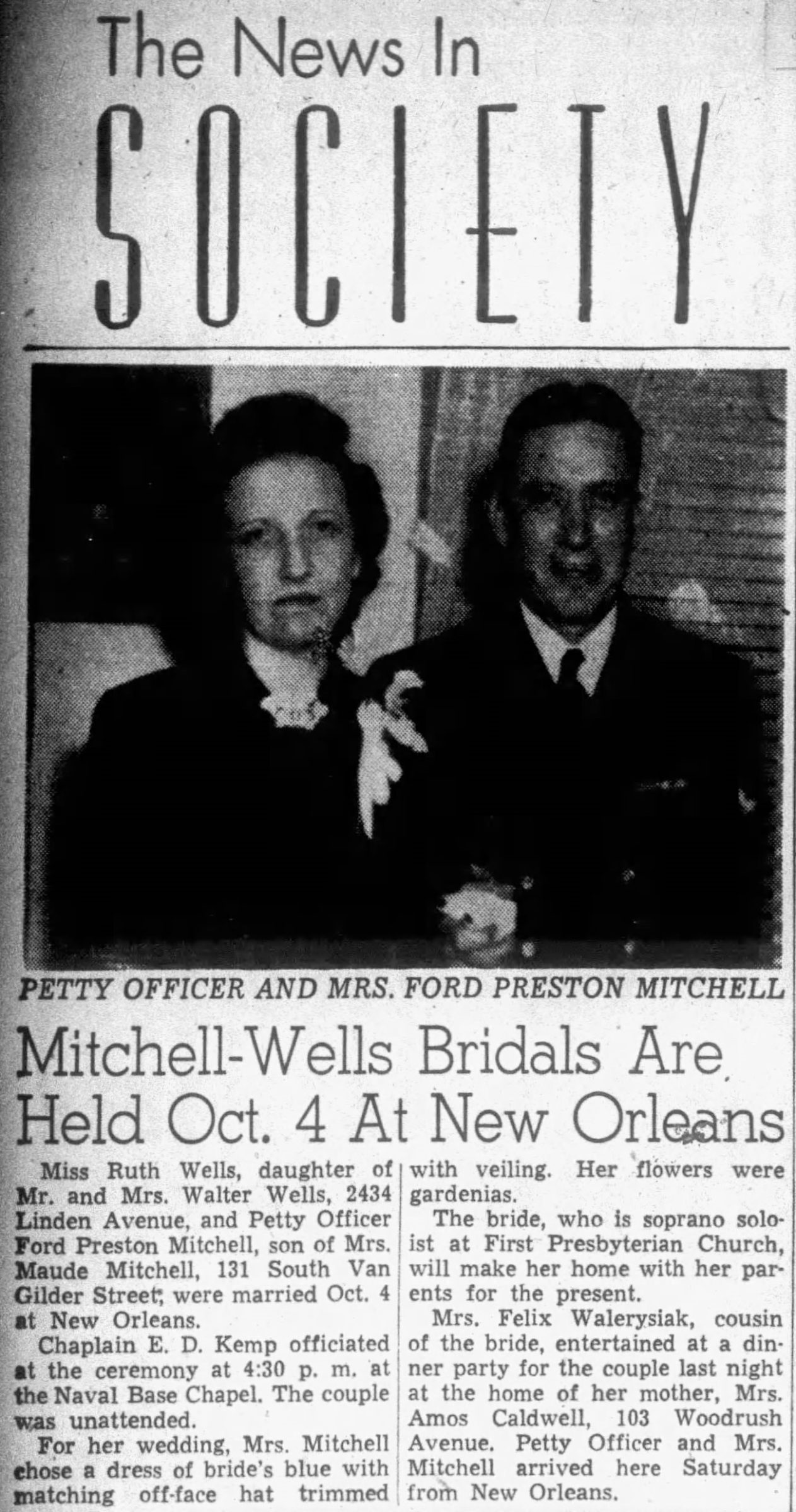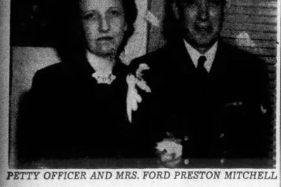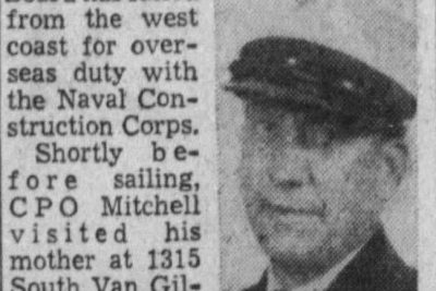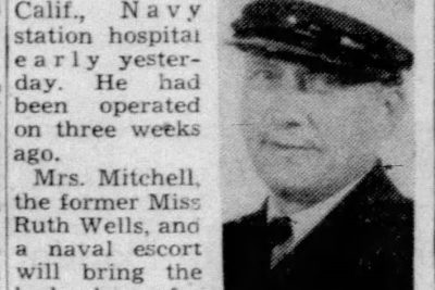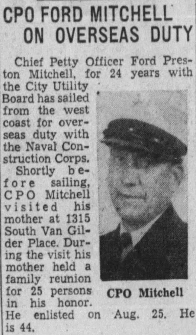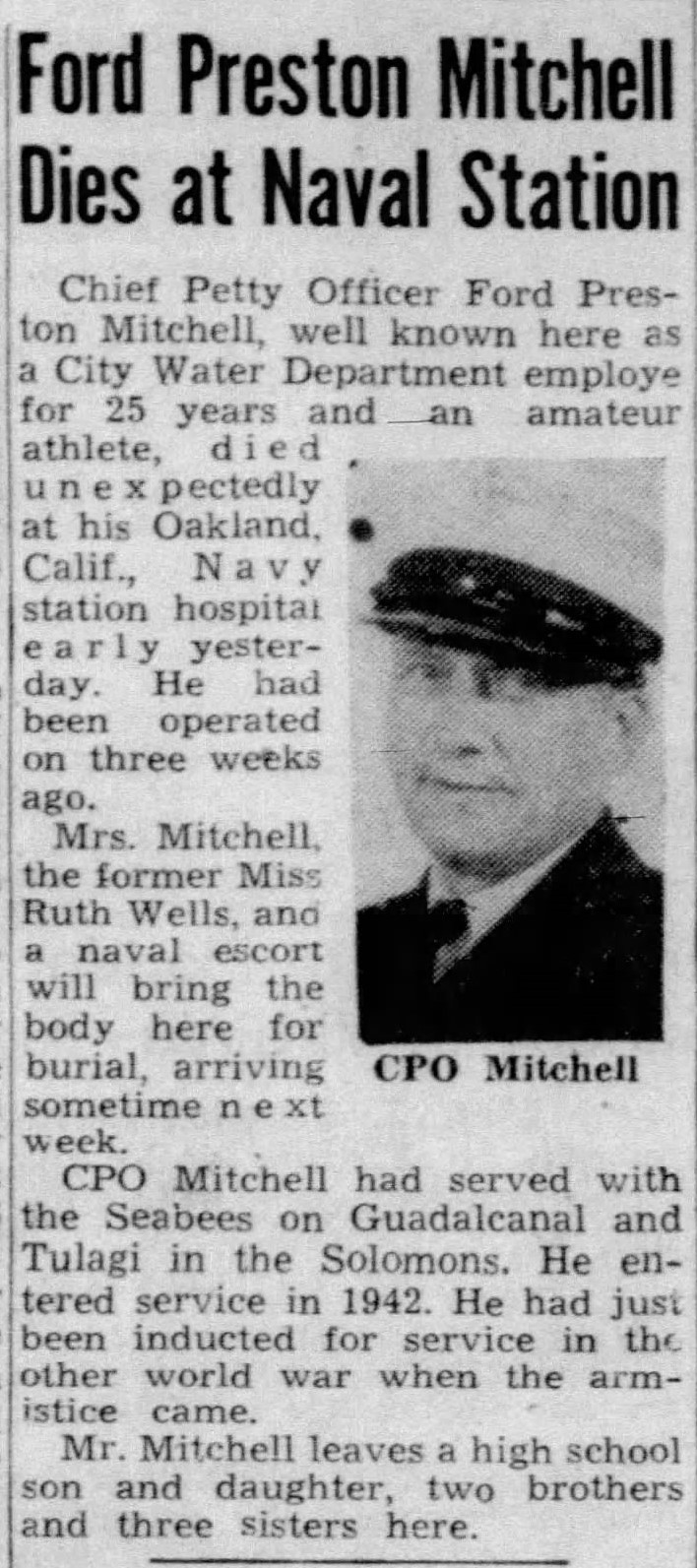 Chief Petty Officer Ford Peston Mitchell, well known here as a City Water Department employe for 25 years and – an amateur athelete, died unexpectedly at his Oakland, Calif., Navy station hospital yearly yesterday. He had been operated on three weeks ago. Mrs. Mitchell, the former Miss Ruth Wells, and a naval escort will bring the body here for burial, arriving sometime next week. CPO Mitchell had served with the Seabees on Guadalcanal and Tulagi in the Solomons. He entered service in 1942. He had just been inducted for service in the other world war when the armistice came. Mr. Mitchell leaves a high school son and daughter, two brothers and three sisters.