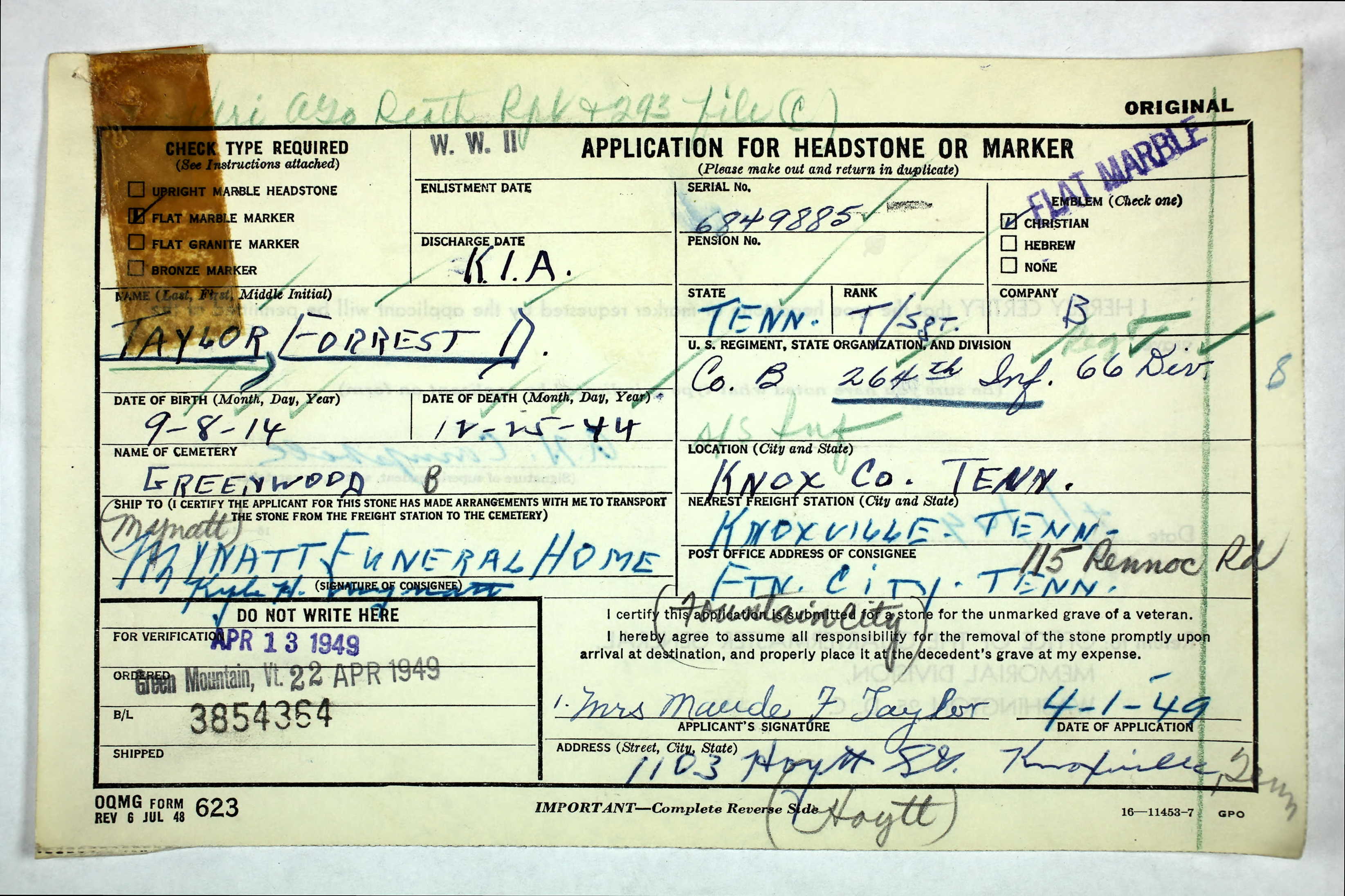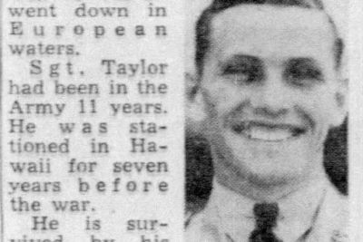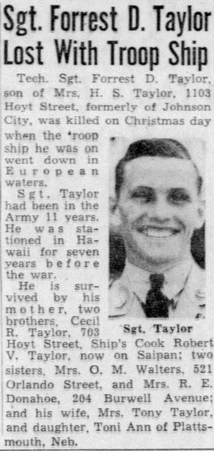 Tech. Sgt. Forrest D. Taylor, son of Mrs. H.S. Taylor, 1103 Hoyt Street, formerly of Johnson City, was killed on Christman day when the troop ship he was on went down in European waters. Sgt Taylor had been in the Army 11 years. He was stationed in Hawaii for seven years before the war. He is survived by his mother, two brothers, Cecil R. Taylor, 703 Hoyt Street, Ship’s Cook Robert V. Taylor, now on Saipan; two sisters, Mrs. O.M. Walters, 521 Orlando Street, and Mrs. R.E. Donahoe, 204 Burwell Avenue; and his wife, Mrs. Tony Taylor, and daughter Toni Ann of Plattsmouth, Neb.