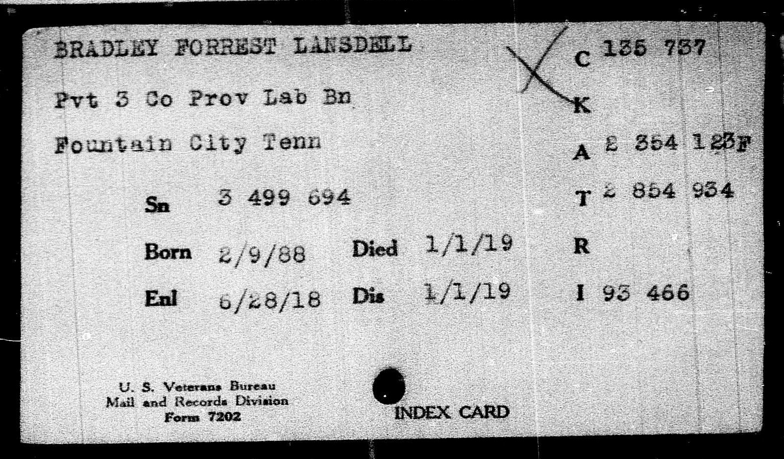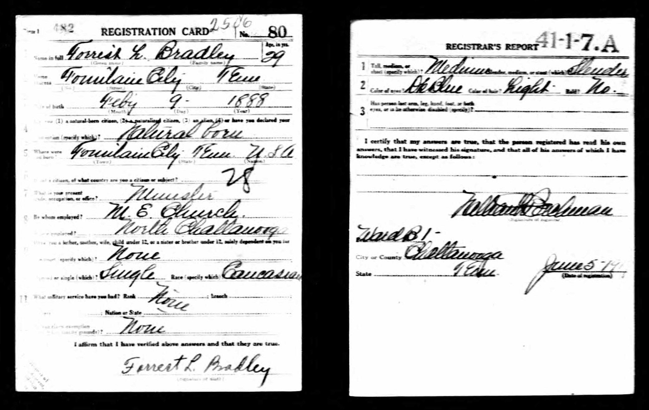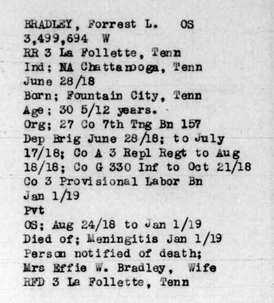 Forrest Lansdell Bradley was born in Fountain City, TN, son of John Barton Bradley and Cynthia D. Ledgerwood. He was the husband of Effie Mae Walker in Campbell County, Tenn. He was a Methodist minister and served as chaplain to Company G, 330th Infantry Regiment, 83rd Division. He died Jan. 1, 1919, of meningitis at sea on the way home from Europe.