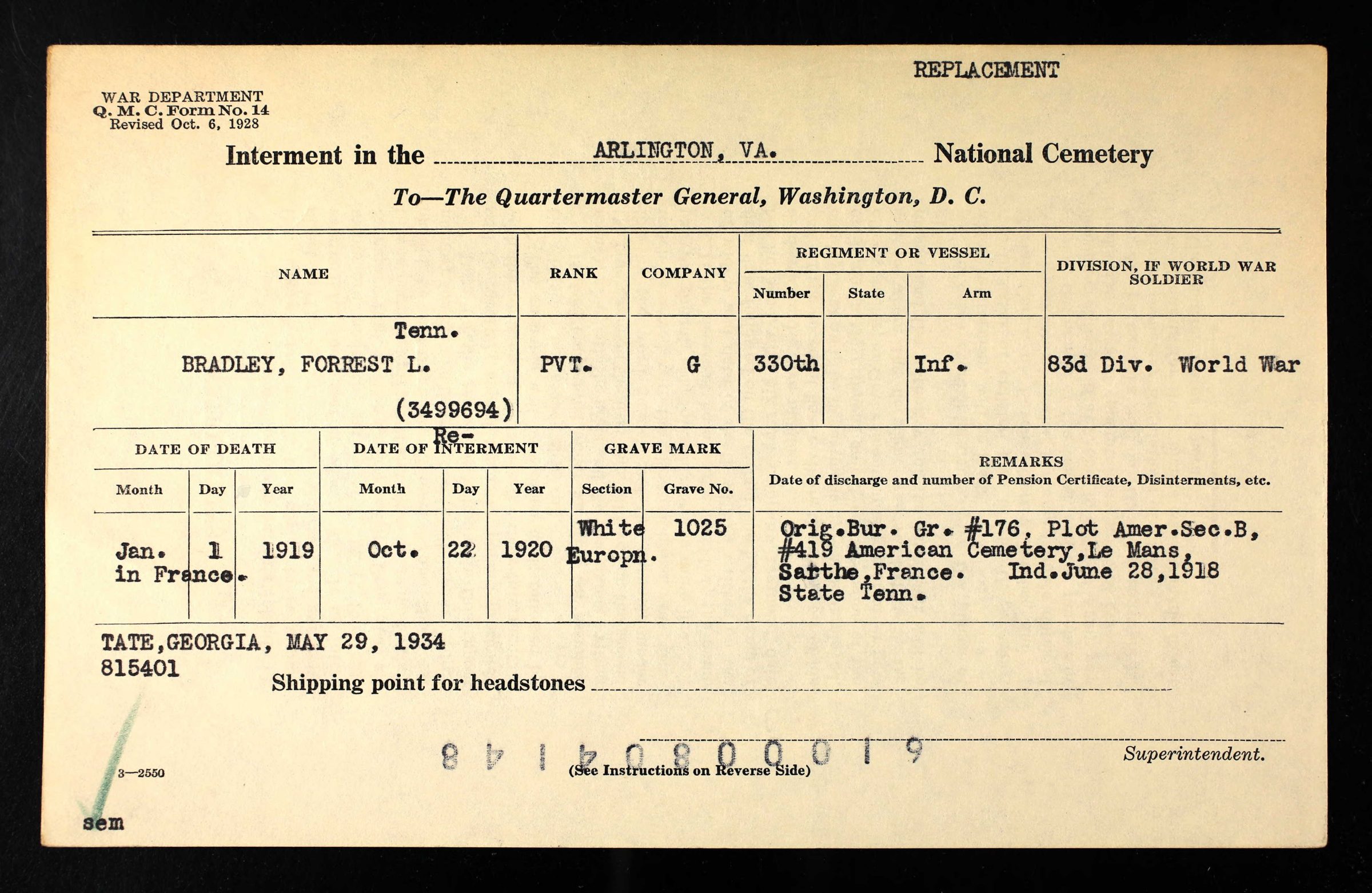 Pvt Bradley was originally buried at the American Cemetery, Le Mans, Sarthe, France. He is buried at Arlington National Cemetery, Va.