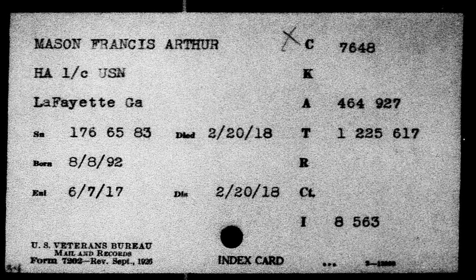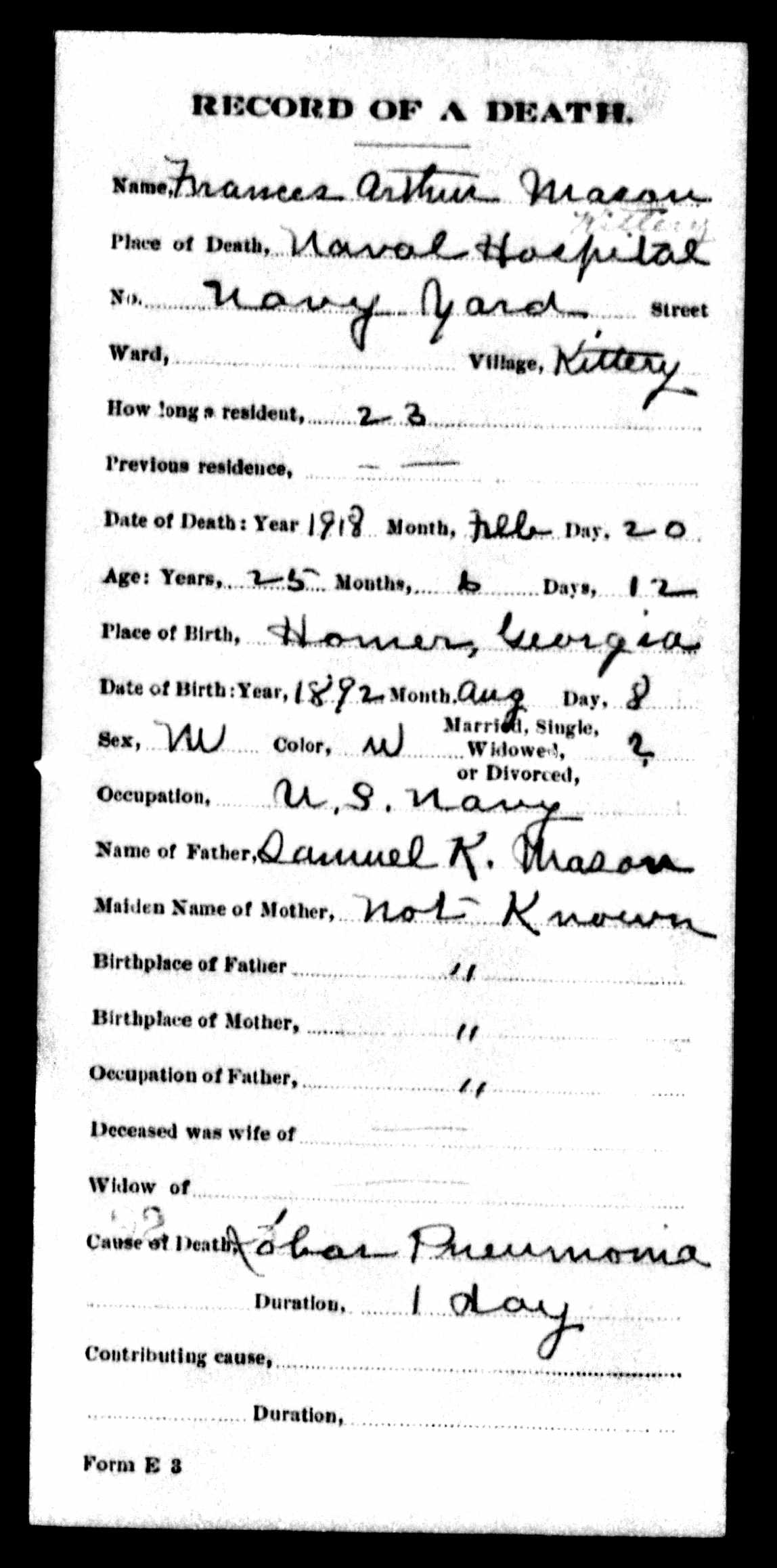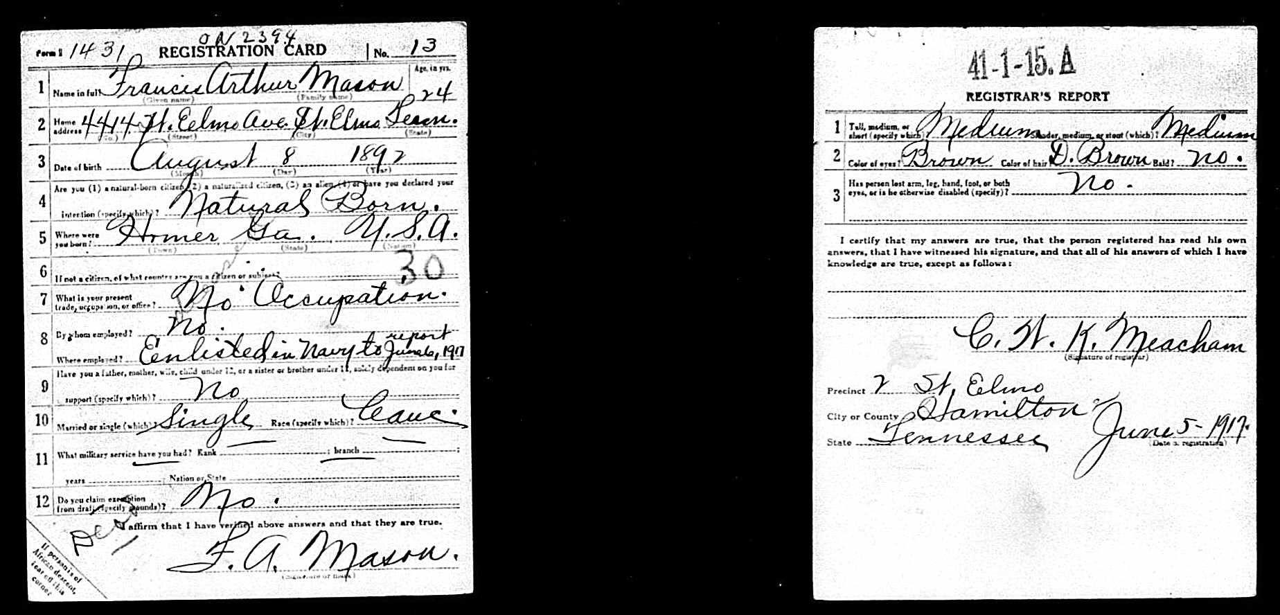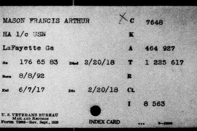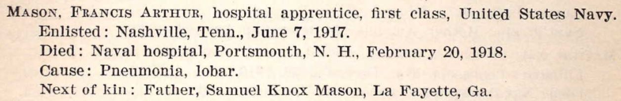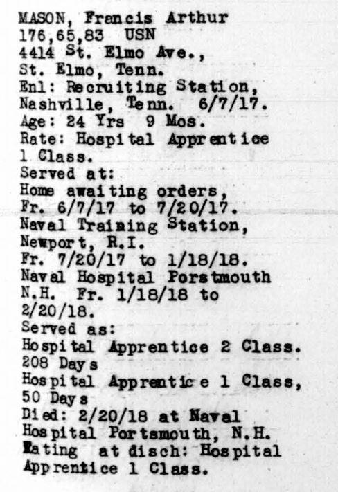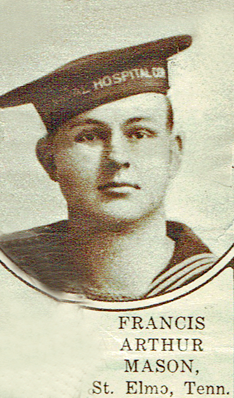 Francis Arthur Mason was born on August 8, 1892, in Homer, Georgia, the son of Samuel Knox Mason and Martha Elizabeth Haulbrook Mason. He had many siblings, including brothers, Charlie, Garrett, Larkin, and Samuel, and sister, Ollive. His father worked as a farmer in Calhoun, Georgia, before moving to Hamilton County. Mason was living in the St. Elmo neighborhood of Chattanooga when he enlisted in the United States Navy as a Hospital Apprentice, 1st Class, in Nashville, Tennessee, on June 7, 1917. While stationed in New Hampshire, he became ill with a respiratory disease, and passed away at Portsmouth Naval Hospital on February 20, 1918.