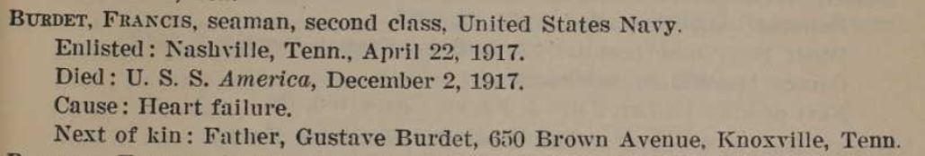 Francis Joseph Burdet volunteered his services to ths U.S. Navy on April 8, 1917. After a period of training at Norfolk, VA, was assigned for duty to the U.S.S. America. Died of heart failure December 2, 1917, while on the above mentioned boat en route to the states.