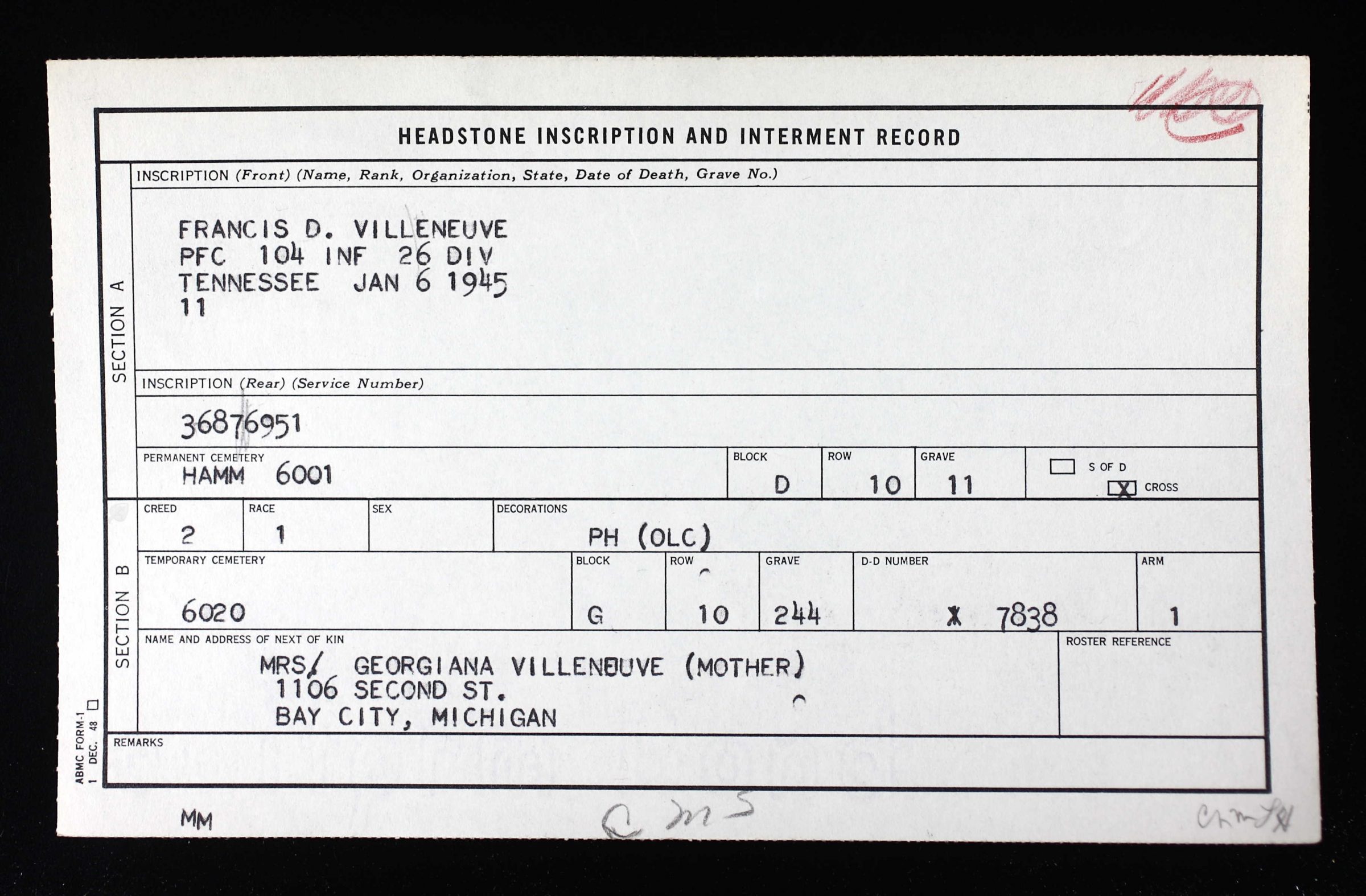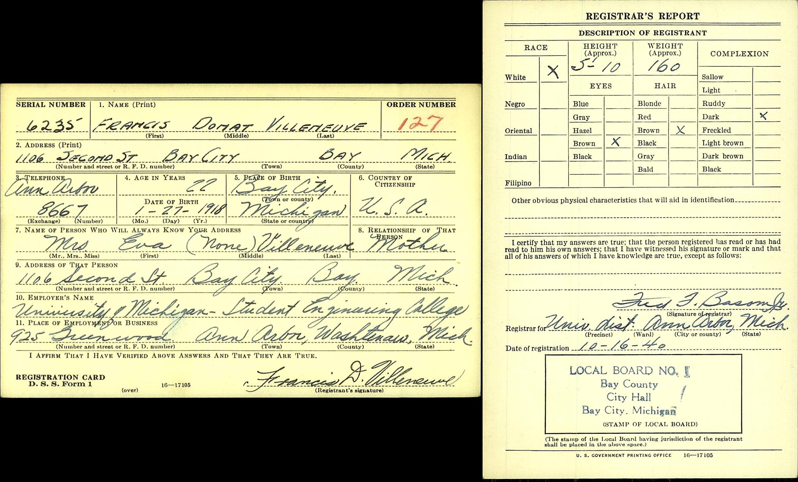 Francis Donat Villeneuve was born in Bay City, Bay County, Michigan, the son of Frank J. Villenueve and Eva Georgiana Landry.