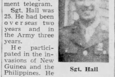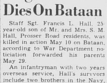 Staff Sgt. Francis Leroy Hall, son of Mr. and Mrs. S.M. Hall, Prosser Road, Route 5, was killed in action on Bataan May 10, according to a War Department Telegram. Sgt. Hall Was 25. He had been overseas two years and in the Army Three years. He participated in the invasions of New Guinea and the Philippines. He was decorated once for outstanding service in New Guinea. Besides his parents, he is survived by two brothers in service, Petty Officer William T. Hall, now home on emergency leave, who spent 38 months in the South Pacific and is now stationed in Florida, and Seaman First Class Hughes S. Hall, who has been in the South Pacific several months; and four other brothers and three sisters.