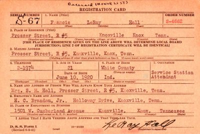 Francis Leroy Hall was born in White County, Indiana, the son of Samuel Moses (Sam) Hall and Dicey Idella Warwick.