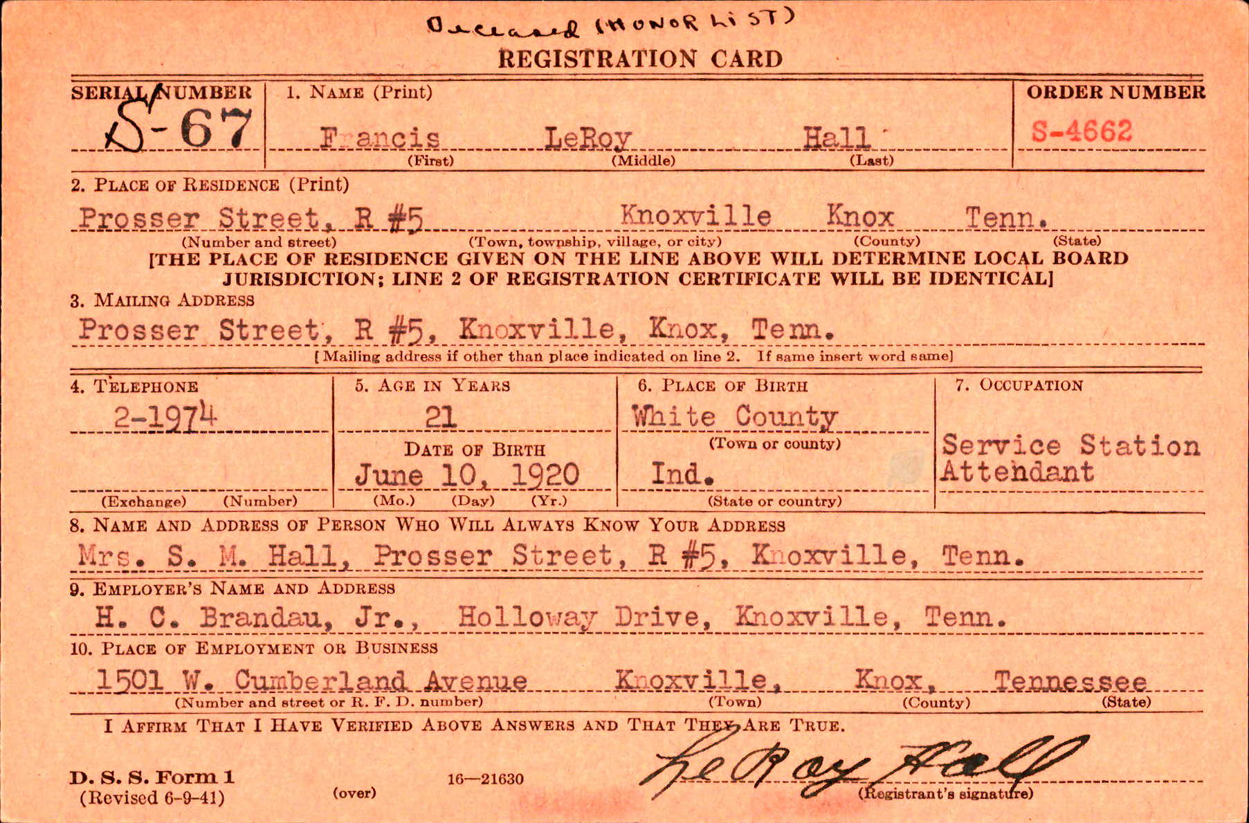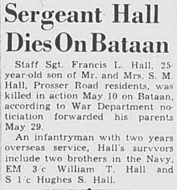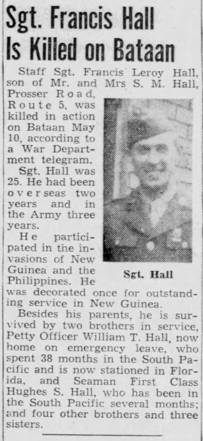 Staff Sgt. Francis Leroy Hall, son of Mr. and Mrs. S.M. Hall, Prosser Road, Route 5, was killed in action on Bataan May 10, according to a War Department Telegram. Sgt. Hall Was 25. He had been overseas two years and in the Army Three years. He participated in the invasions of New Guinea and the Philippines. He was decorated once for outstanding service in New Guinea. Besides his parents, he is survived by two brothers in service, Petty Officer William T. Hall, now home on emergency leave, who spent 38 months in the South Pacific and is now stationed in Florida, and Seaman First Class Hughes S. Hall, who has been in the South Pacific several months; and four other brothers and three sisters.