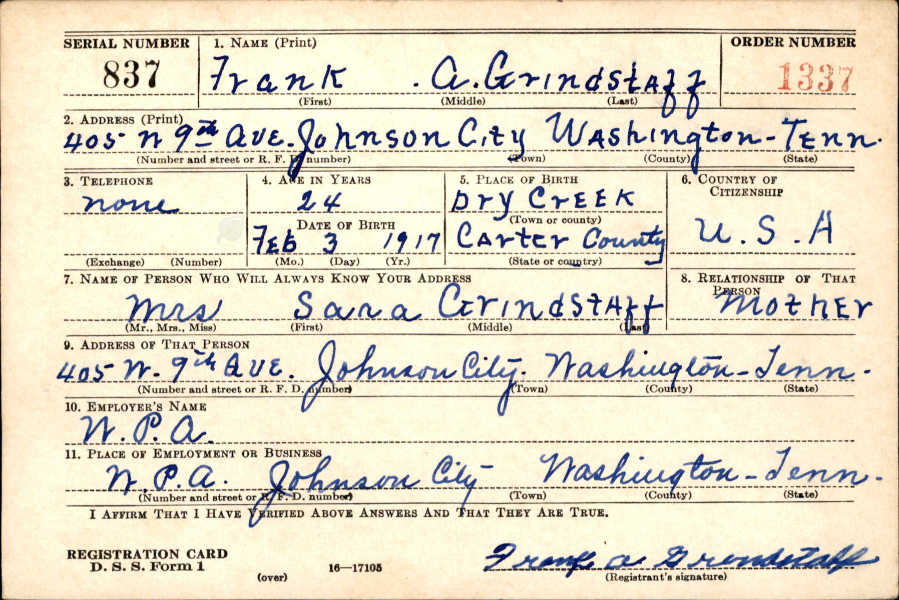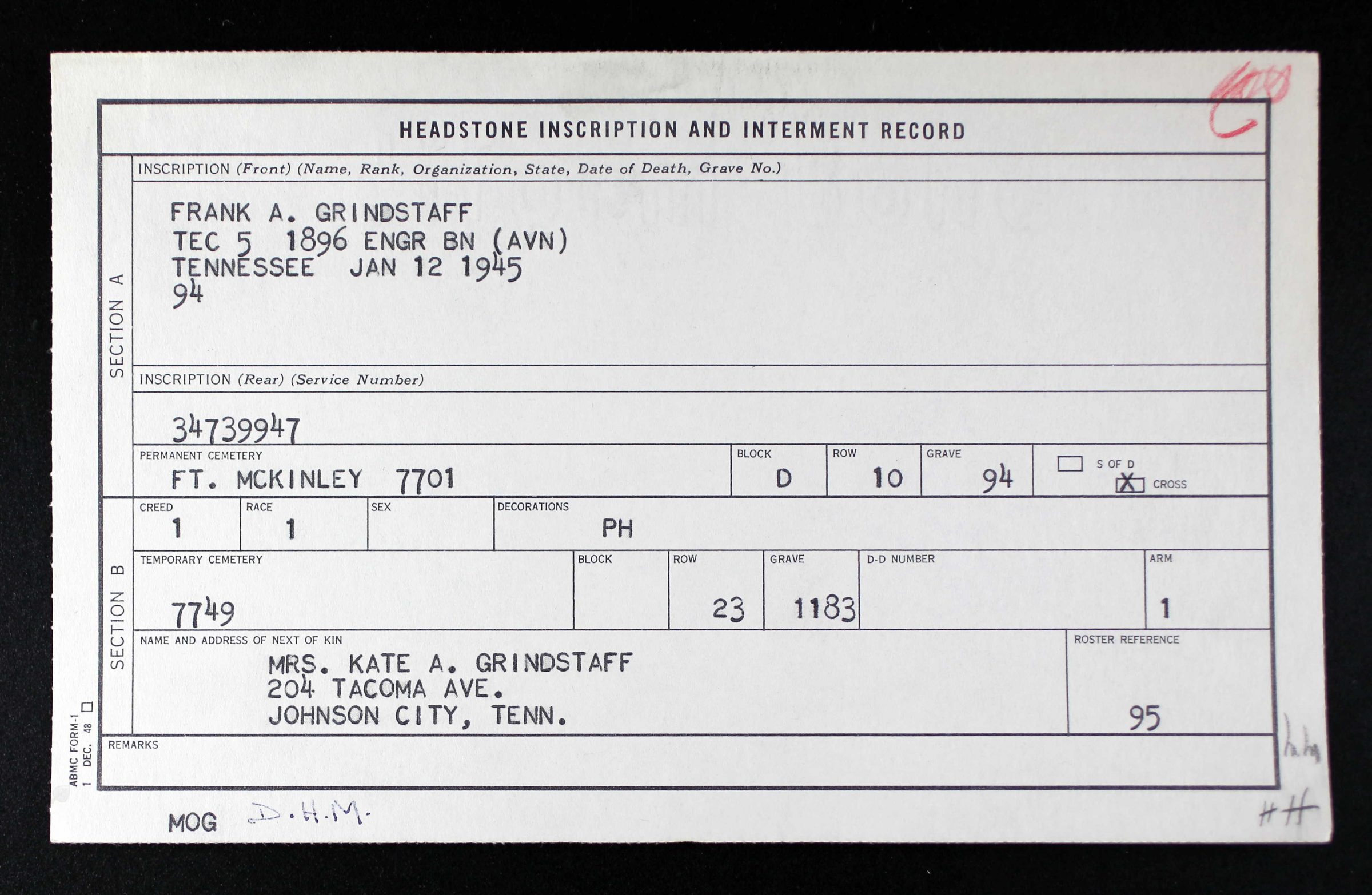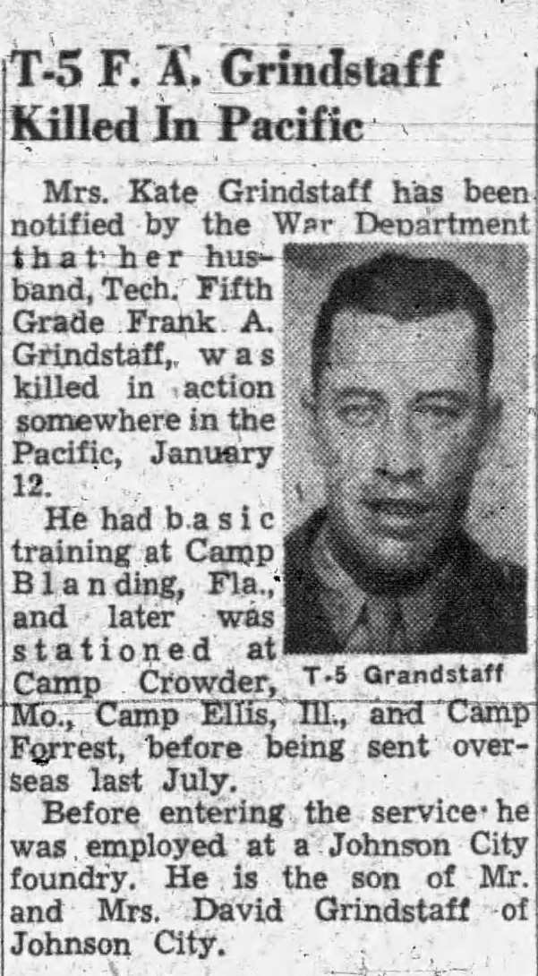 Mrs. Kate Grindstaff has been notified by the War Department that her husband, Tech. Fifth Grade Frank A. Grindstaff was killed in action somewhere in the Pacific, January 12. He had basic training at Camp Blanding, Fla., and later was stationed at Camp Crowder, Mo., Camp Ellis, Ill., and Camp Forrest, before being sent overseas last July. Before entering the service he was employed at a Johnson City foundry. He is the son of Mr. and Mrs. David Grindstaff of Johnson City.