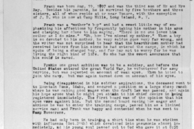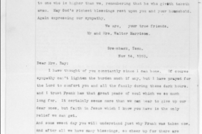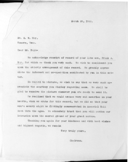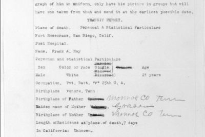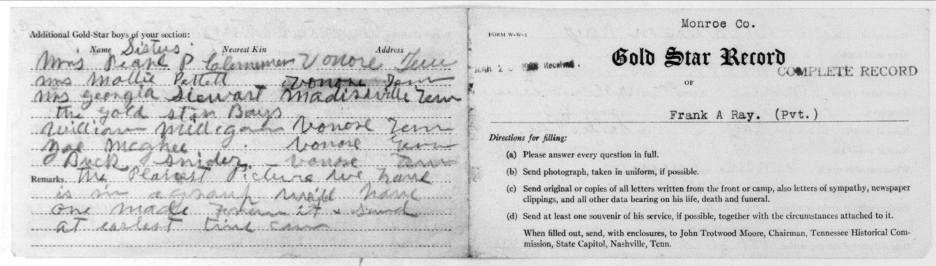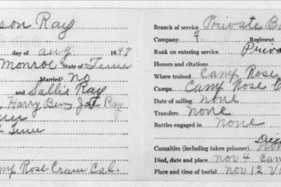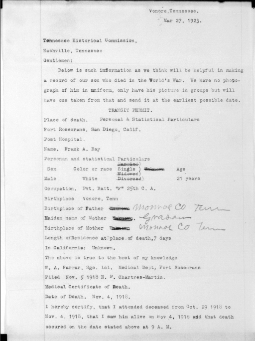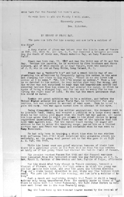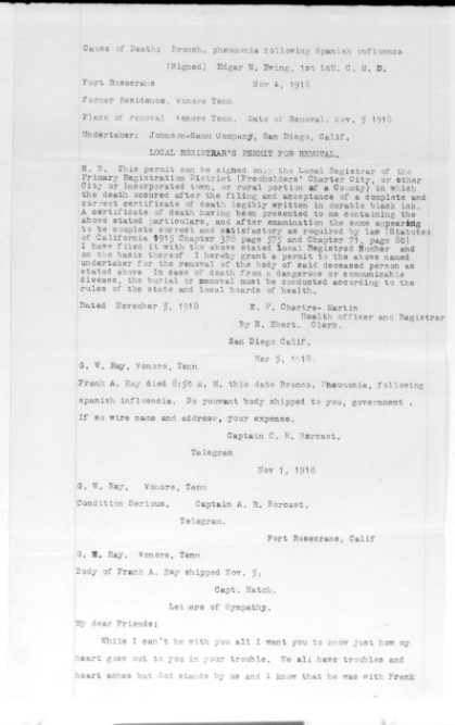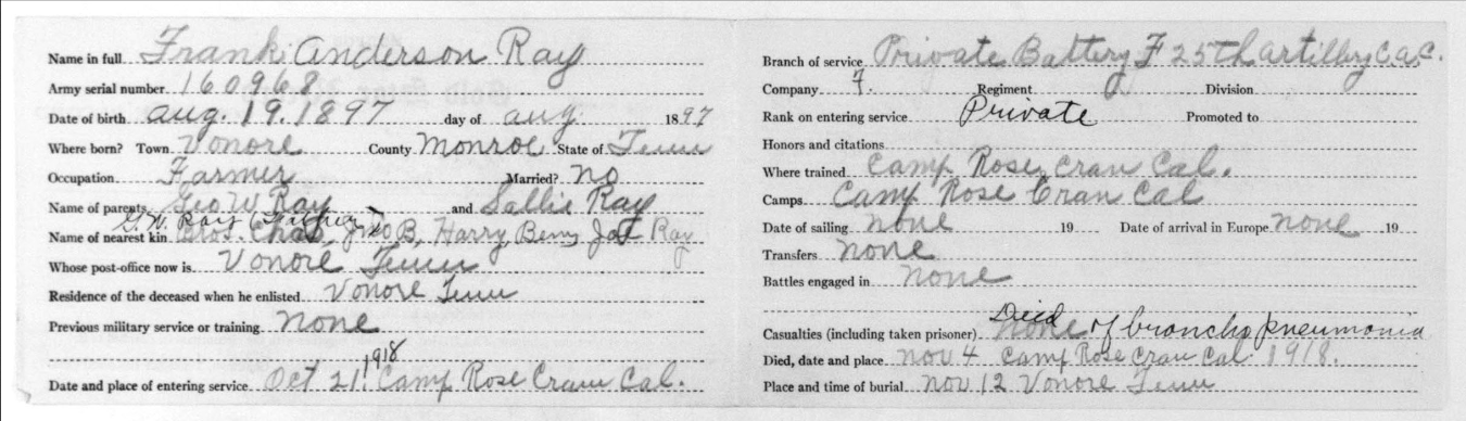 Frank Anderson Ray was the son of George Washington Ray and Sarah “Sallie” A. Grayson. He entered the service October 1, 1918 at Fort Rosecran in California and served with the Coast Artillery. He died of broncho pneumonia November 4, 1918 at Fort Rosecran in California.
