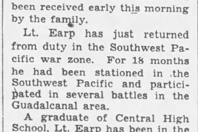Lt. Earp has just returned from duty in the Southwest Pacific war zone. For 18 months he had been stationed in the Southwest Pacific and participated in several battles in the Guadalcanal area. A graduate of Central High School, Lt. Earp has been in the navy for the past seven years. He won his wings in 1939 while stationed at the naval base at Pensacola, Fla. He was commissioned as a lieutenant, junior grade, about four months ago while still on duty in the war zone.